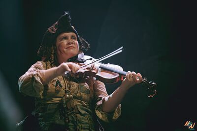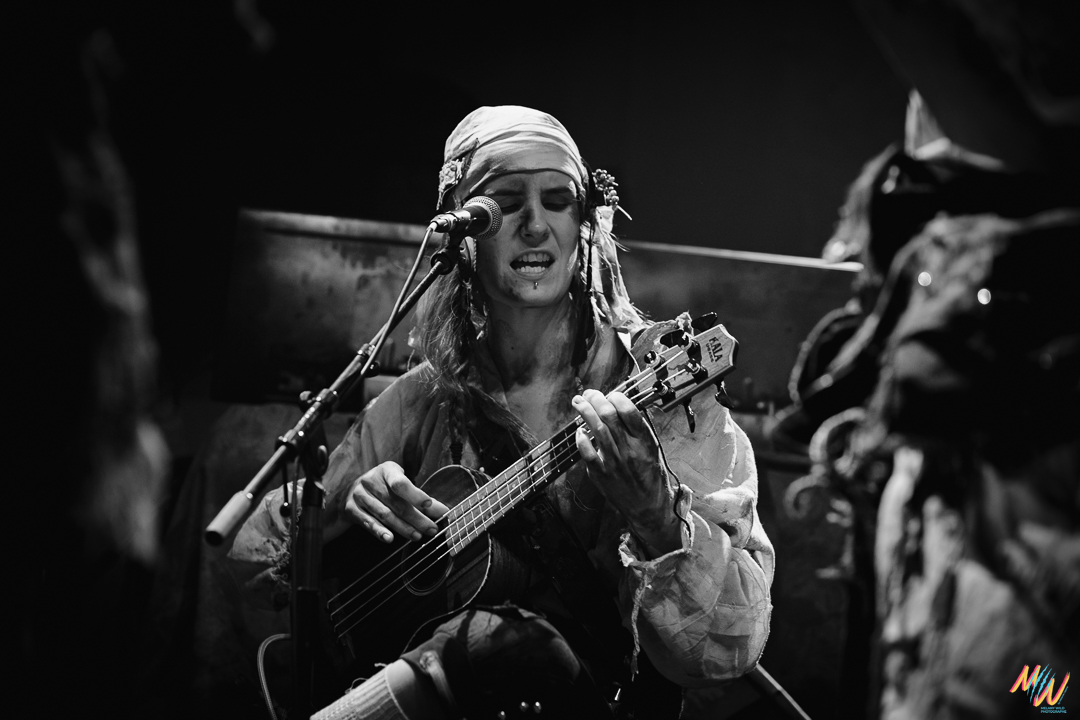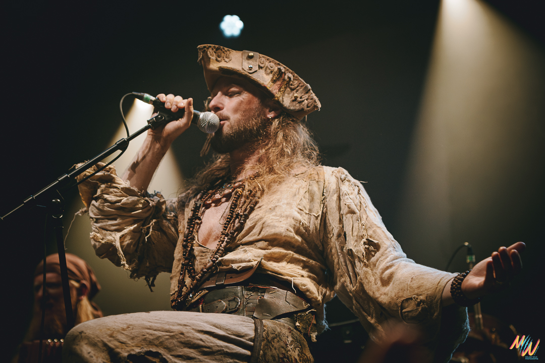 À peine arrivée, je découvre de nombreux fans costumés en pirates ou en tenues d’époque médiévale. Pas de doute : la soirée s’annonce immersive ! Elle débute en douceur avec le duo suédois Pettersson & Fredriksson, amis depuis leurs années lycée. L’un joue de la mandola nordique et du luth, tandis que le second est un violoniste talentueux. Ce soir, la scène est joliment décorée, et ce mélange de musiques traditionnelles et folkloriques nous donne le ton du voyage que nous nous apprêtons à vivre. Une mise en bouche parfaite avant d’accueillir le second groupe suédois de la soirée : les corsaires de Ye Banished Privateers.