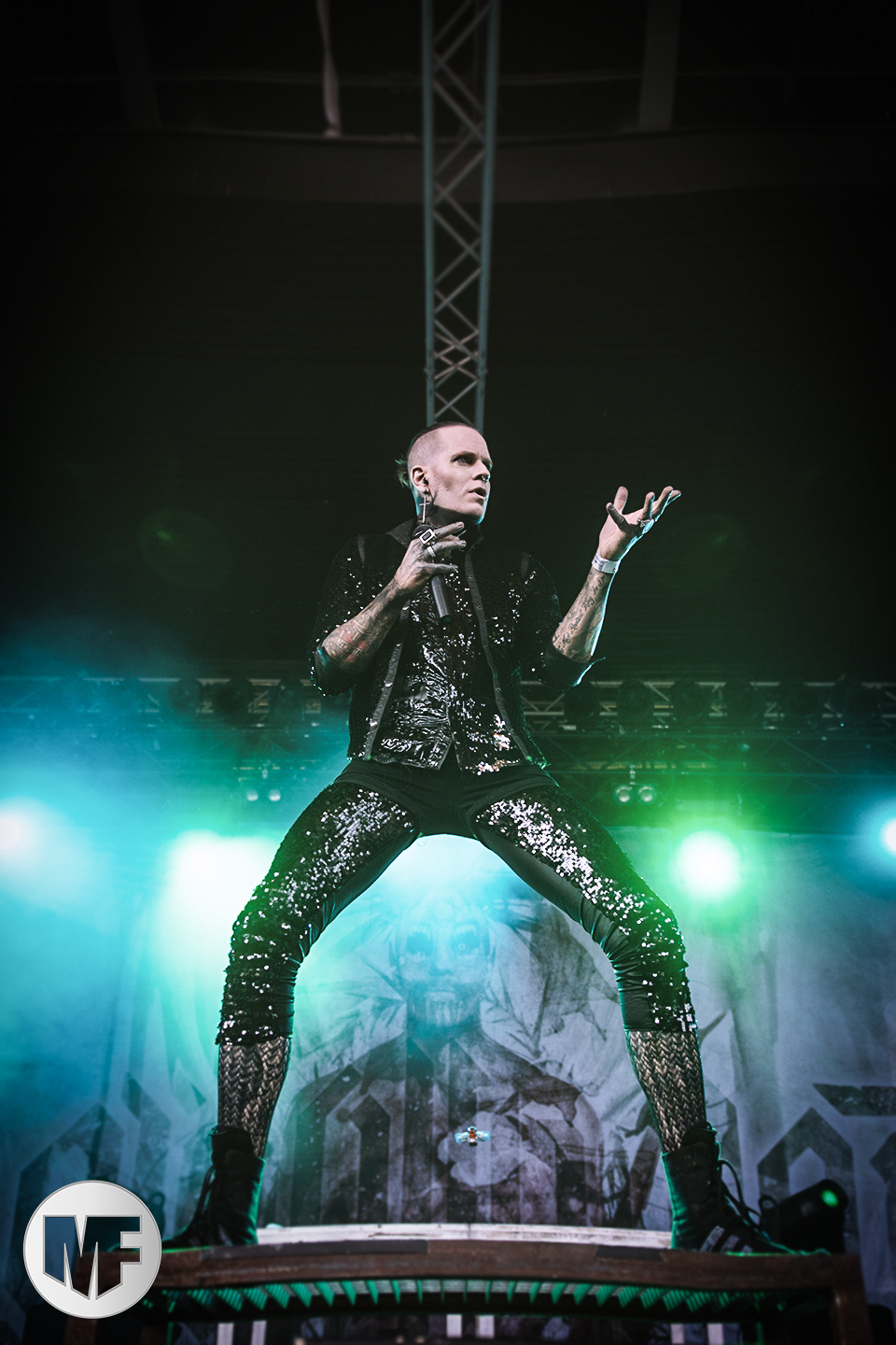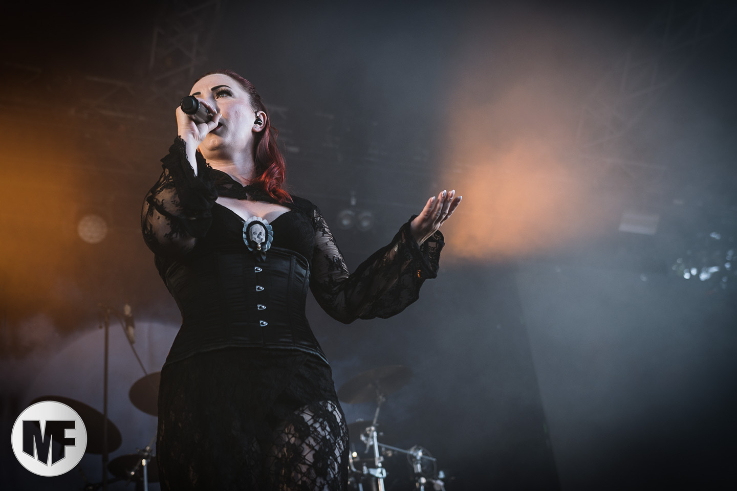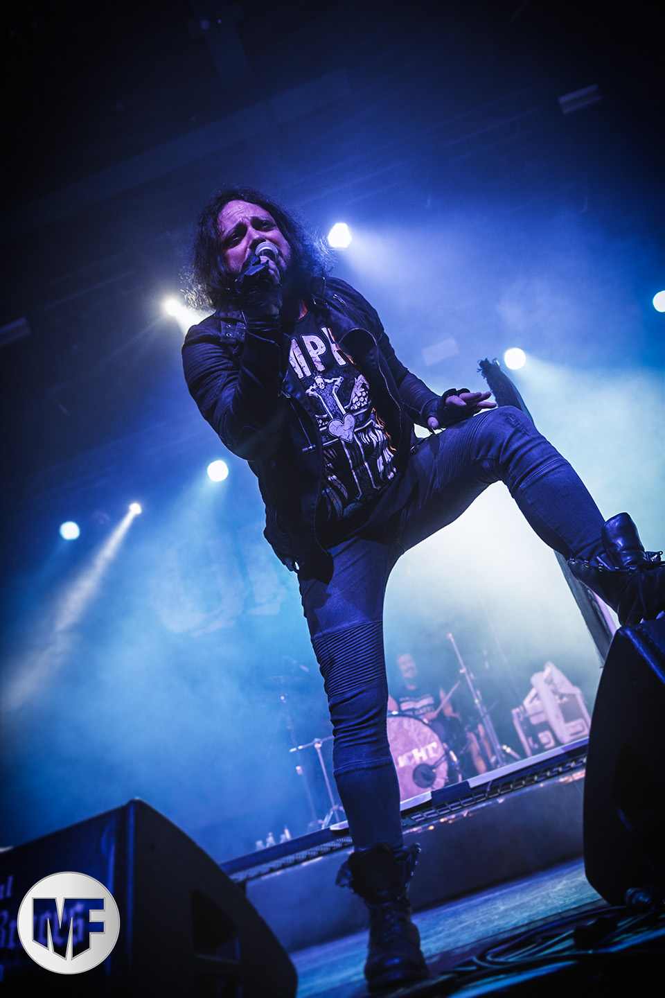 Le duo laisse la place à ceux qui auraient dû selon nous être programmés plus tard dans la soirée, tant leur show soulève l’enthousiasme d’un public de plus en plus nombreux : LORD OF THE LOST. Sur la scène désormais impeccable, époussetée consciencieusement par un Gared Dirge en grande tenue de femme de ménage, déclenchant fous rires dans le public, le spectacle peut commencer. Dès les premières notes, on sent que la prestation va encore tenir toutes les promesses : bien campé en hauteur au fond de la scène, armé de sa guitare, le charismatique frontman Chris Harms lâche toute la puissance de sa voix sur On This Rock I Will Build My Church, donnant ainsi le tempo d’un set qui ne connaîtra aucun temps mort.