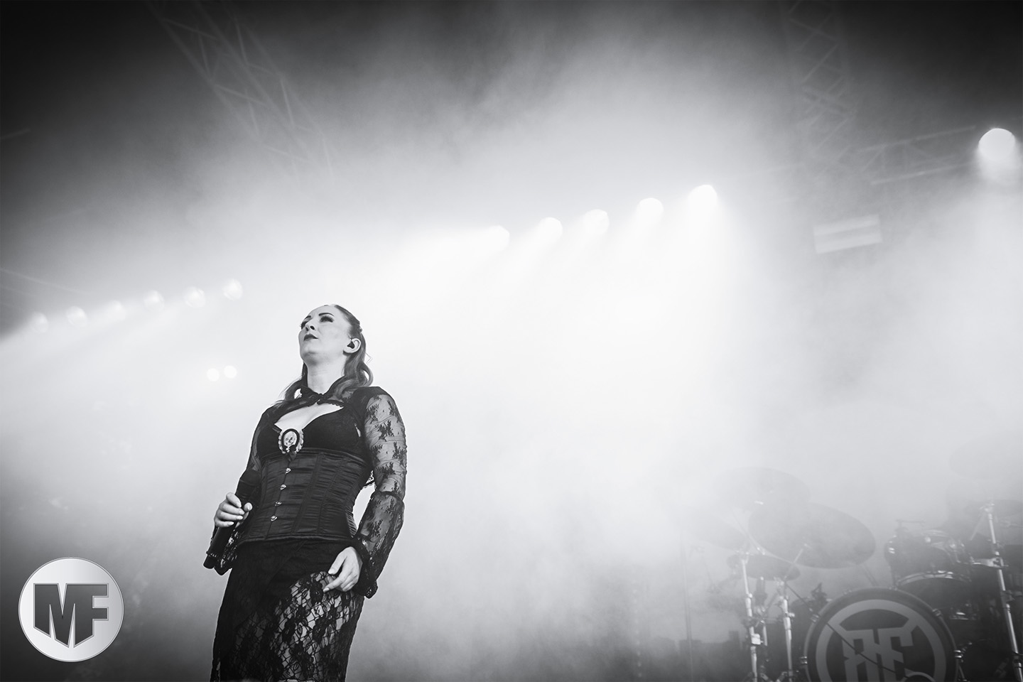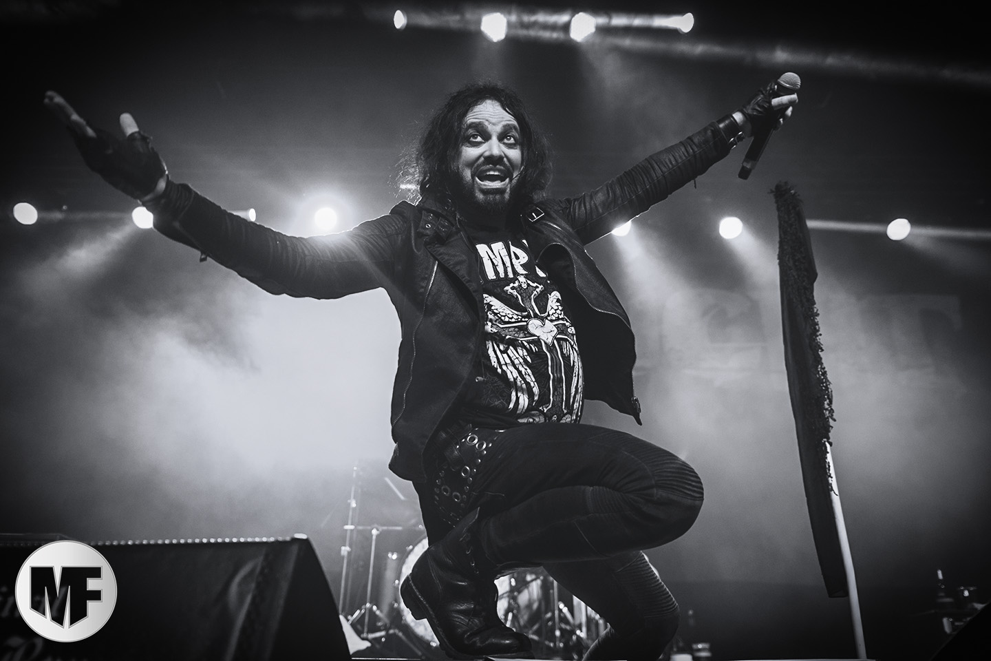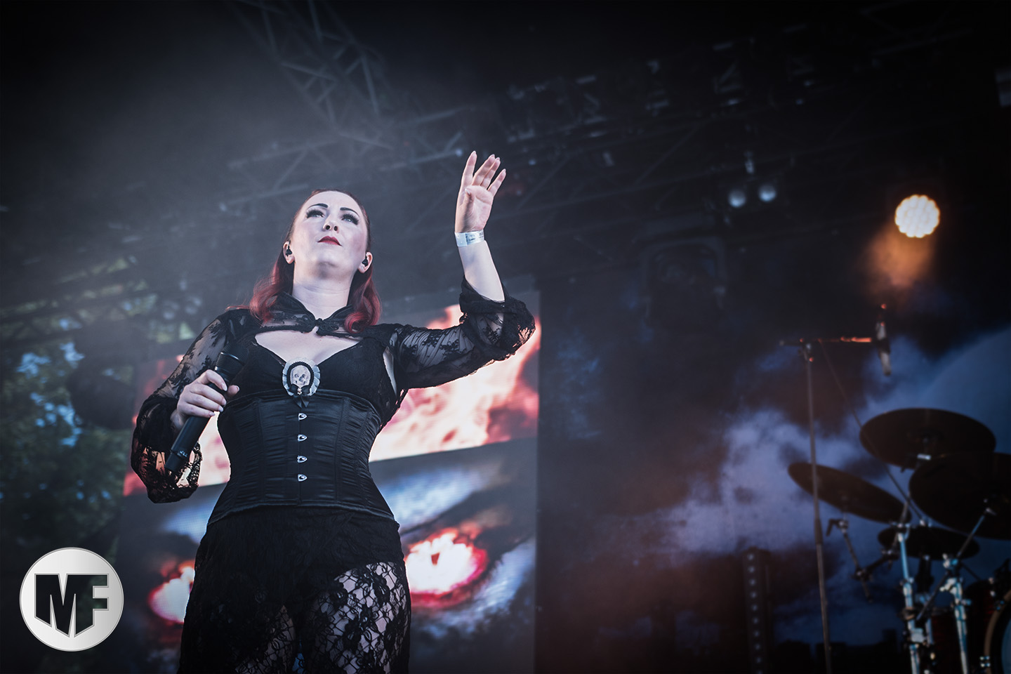 Le duo laisse la place à ceux qui auraient dû selon nous être programmés plus tard dans la soirée, tant leur show soulève l’enthousiasme d’un public de plus en plus nombreux : LORD OF THE LOST. Sur la scène désormais impeccable, époussetée consciencieusement par un Gared Dirge en grande tenue de femme de ménage, déclenchant fous rires dans le public, le spectacle peut commencer. Dès les premières notes, on sent que la prestation va encore tenir toutes les promesses : bien campé en hauteur au fond de la scène, armé de sa guitare, le charismatique frontman Chris Harms lâche toute la puissance de sa voix sur On This Rock I Will Build My Church, donnant ainsi le tempo d’un set qui ne connaîtra aucun temps mort.