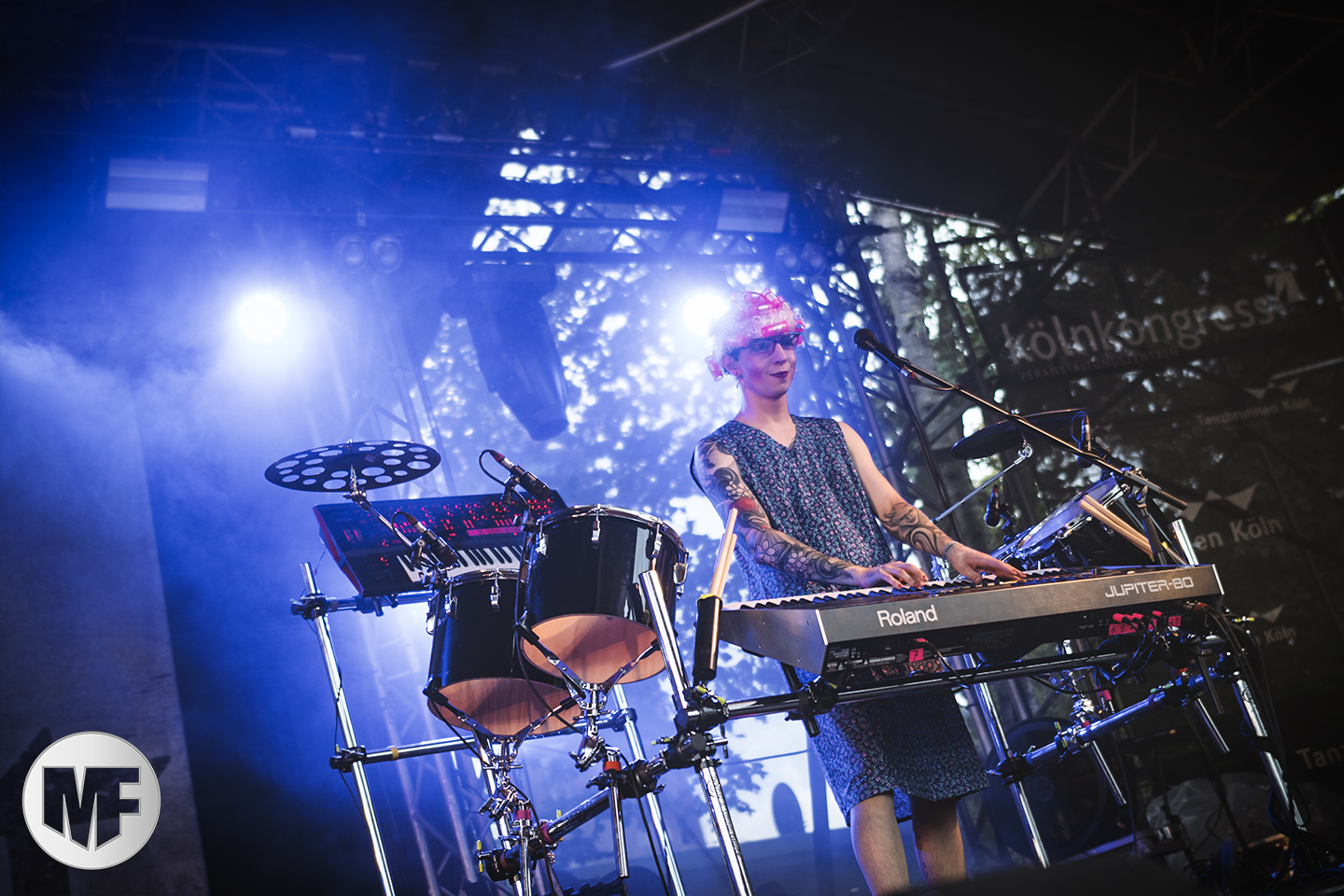 Alors on en profite pour découvrir les environs et goûter la bière locale. Le ciel commence déjà à se couvrir de vilains nuages noirs, confirmant en cela les prévisions météorologiques. Mais les Allemands sont habitués : parapluies et « Regenponchos » (comprenez : capes de pluie) sont au fond des sacs et prêts à être dégainés si besoin. Lorsque CHROM fait son apparition, il y a foule sous les immenses tentures déployées devant la scène. Véritable référence synthépop/EBM, écumant les festivals et les clubs depuis maintenant une dizaine d’années, les deux musiciens vont transformer les Tanzbrunnen en dance floor (et il est à peine 14h !).