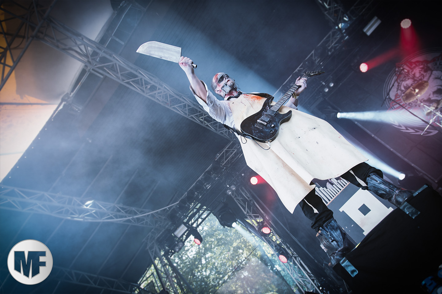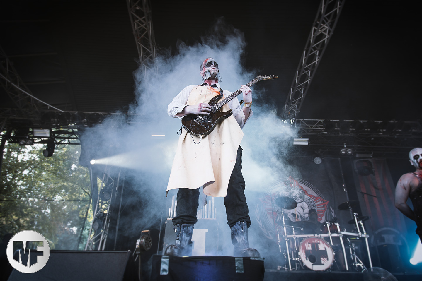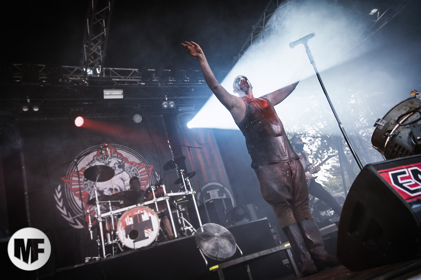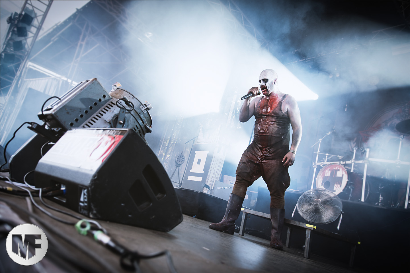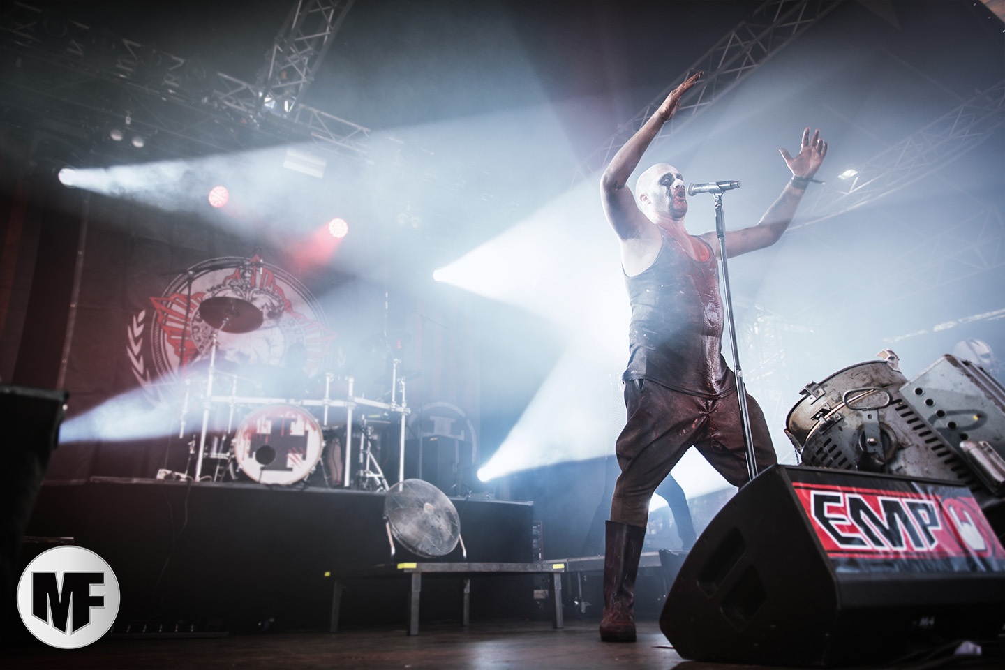 Mais assez traîné, le public est au taquet devant la scène, impatient d’en découdre avec l’un des groupes les plus emblématique de la scène NDH (comprenez Neue Deutsche Härte, nouveau son allemand). Avec leur visuel gore bien reconnaissable sur scène : tenues sanguinolentes, make-up morbide, masques steampunk horrifiques, couteau de boucher… OST+FRONT est un groupe qu’il faut prendre au second voire troisième degré, tant ils se servent de références militaires et violentes pour provoquer. Les paroles elles-mêmes, souvent censurées, sont crues et agressives. En voyant le plastron ensanglanté du chanteur et son maquillage cadavérique, on ne peut s’empêcher de penser à Till Lindemann et ses performances scéniques sur Mein Teil, jusqu’à sa voix dont on sent bien les influences « rammsteiniennes » malgré moins de puissances. Des personnages secondaires, Elsa Edelweiss au look ambigu et sombrero surdimensionné, une infirmière inquiétante, une dominatrice sexy, étoffent le groupe sur de nombreux titres. Les fans s’époumonent dès le début du set sur Fiesta de Sexo (pas besoin de sous-titres), motivés par le chanteur, singulièrement sympathique malgré son accoutrement. Mensch et Heavy Metal maintiennent la pression dans le public. Les rythmes sont remarquables, à la fois martiaux avec une ligne mélodique indéniable. Au final, sous le lâcher de ballons noirs qui annonce la fin des hostilités, on reste quand même scotché par la performance scénique, c’est le plus intéressant des concerts, visuellement parlant jusqu’à maintenant.