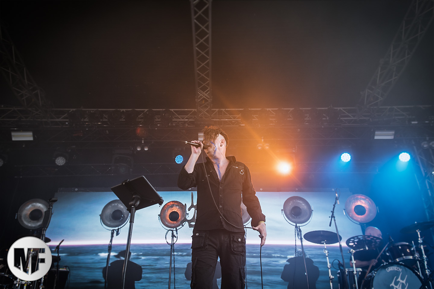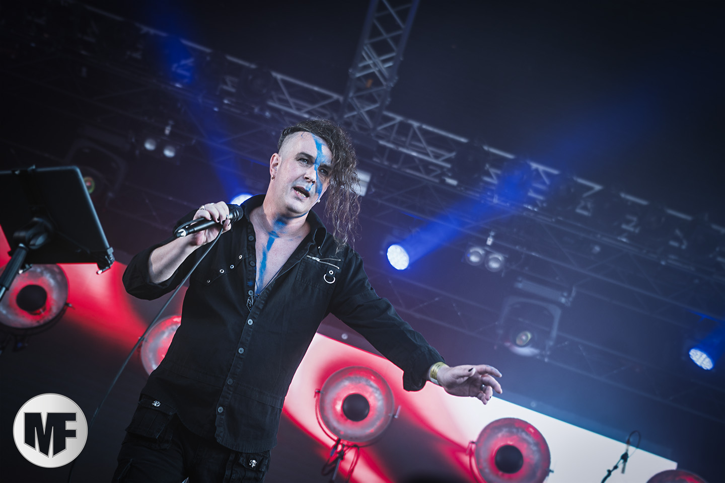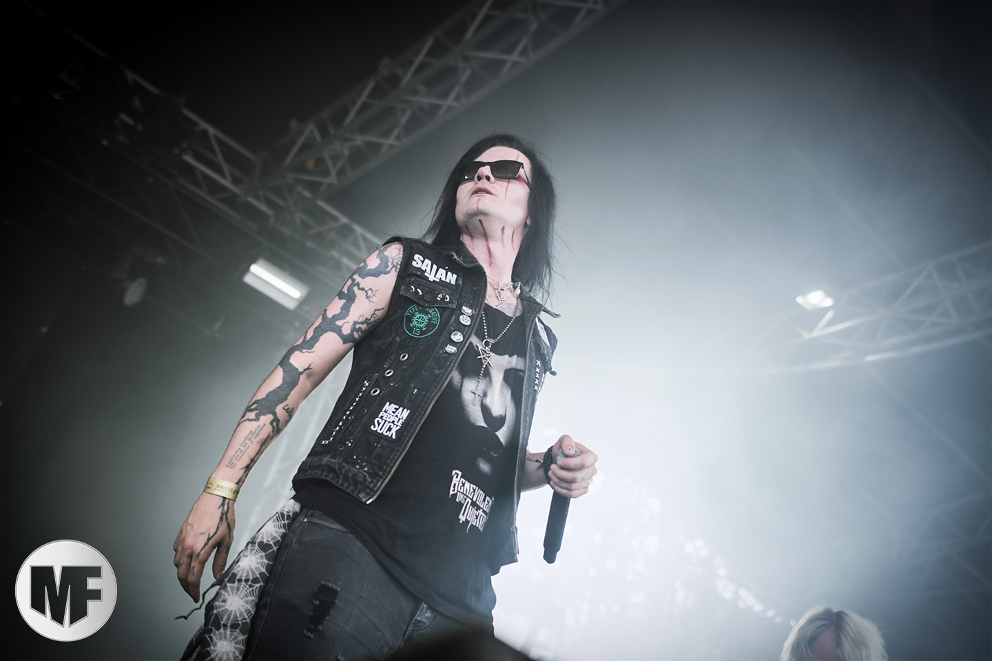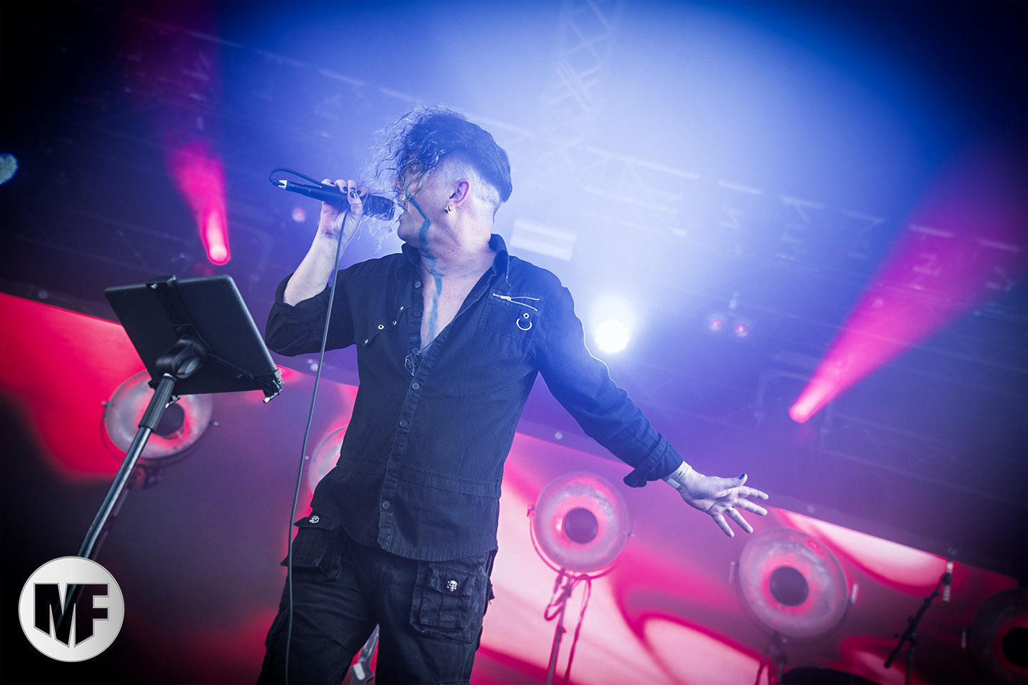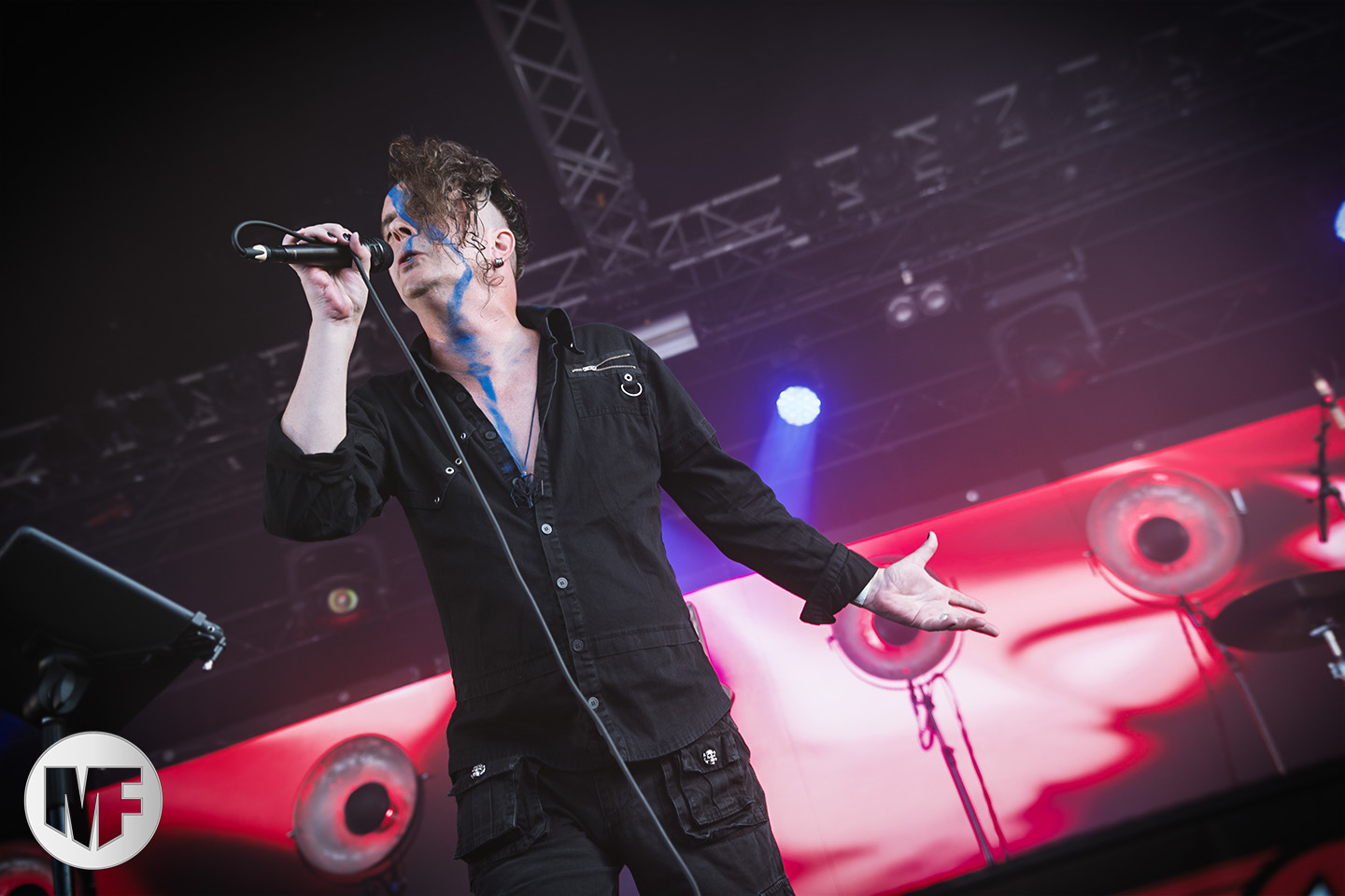 Mais assez traîné, le public est au taquet devant la scène, impatient d’en découdre avec l’un des groupes les plus emblématique de la scène NDH (comprenez Neue Deutsche Härte, nouveau son allemand). Avec leur visuel gore bien reconnaissable sur scène : tenues sanguinolentes, make-up morbide, masques steampunk horrifiques, couteau de boucher… OST+FRONT est un groupe qu’il faut prendre au second voire troisième degré, tant ils se servent de références militaires et violentes pour provoquer. Les paroles elles-mêmes, souvent censurées, sont crues et agressives. En voyant le plastron ensanglanté du chanteur et son maquillage cadavérique, on ne peut s’empêcher de penser à Till Lindemann et ses performances scéniques sur Mein Teil, jusqu’à sa voix dont on sent bien les influences « rammsteiniennes » malgré moins de puissances. Des personnages secondaires, Elsa Edelweiss au look ambigu et sombrero surdimensionné, une infirmière inquiétante, une dominatrice sexy, étoffent le groupe sur de nombreux titres. Les fans s’époumonent dès le début du set sur Fiesta de Sexo (pas besoin de sous-titres), motivés par le chanteur, singulièrement sympathique malgré son accoutrement. Mensch et Heavy Metal maintiennent la pression dans le public. Les rythmes sont remarquables, à la fois martiaux avec une ligne mélodique indéniable. Au final, sous le lâcher de ballons noirs qui annonce la fin des hostilités, on reste quand même scotché par la performance scénique, c’est le plus intéressant des concerts, visuellement parlant jusqu’à maintenant.