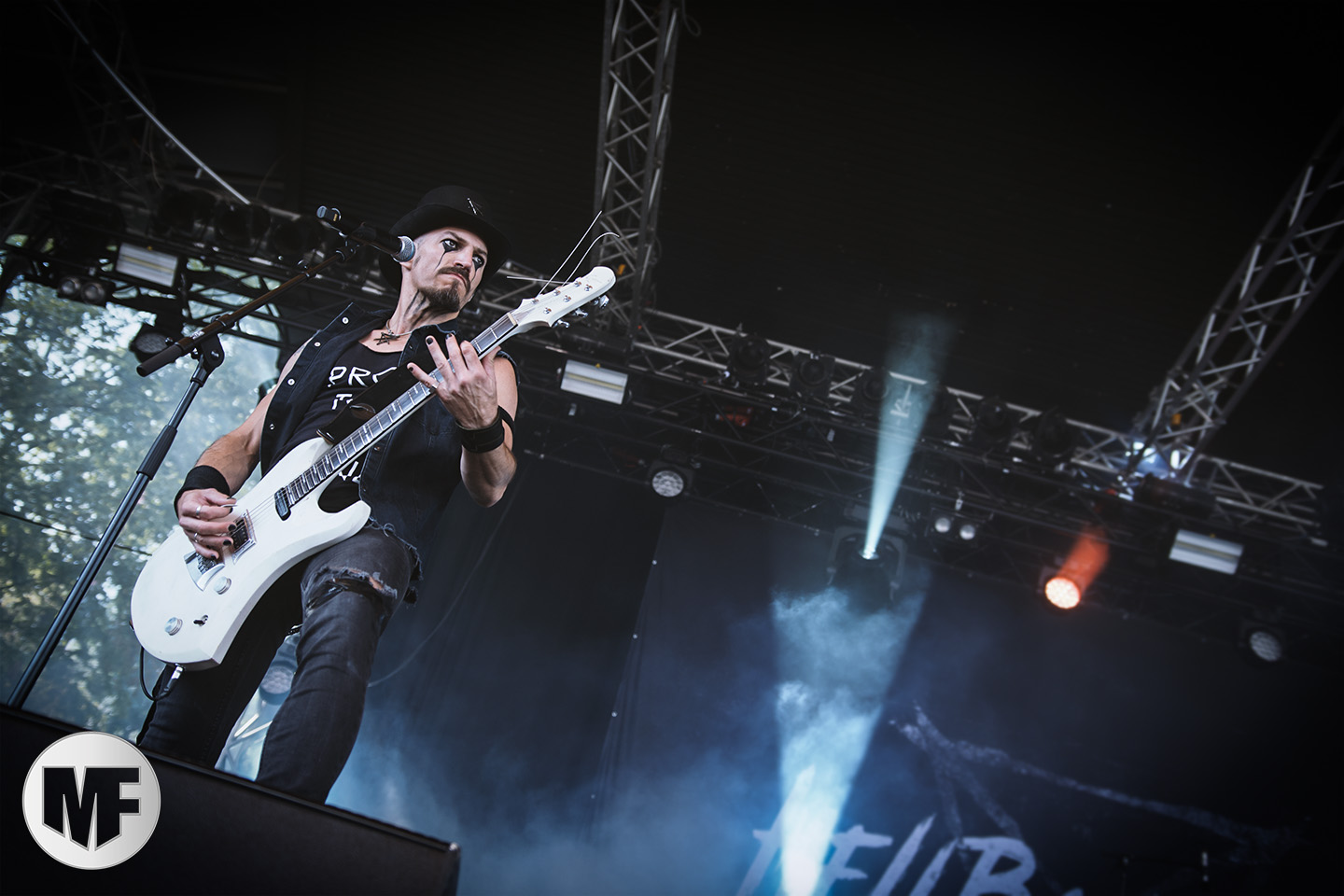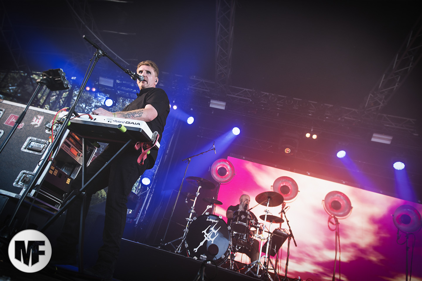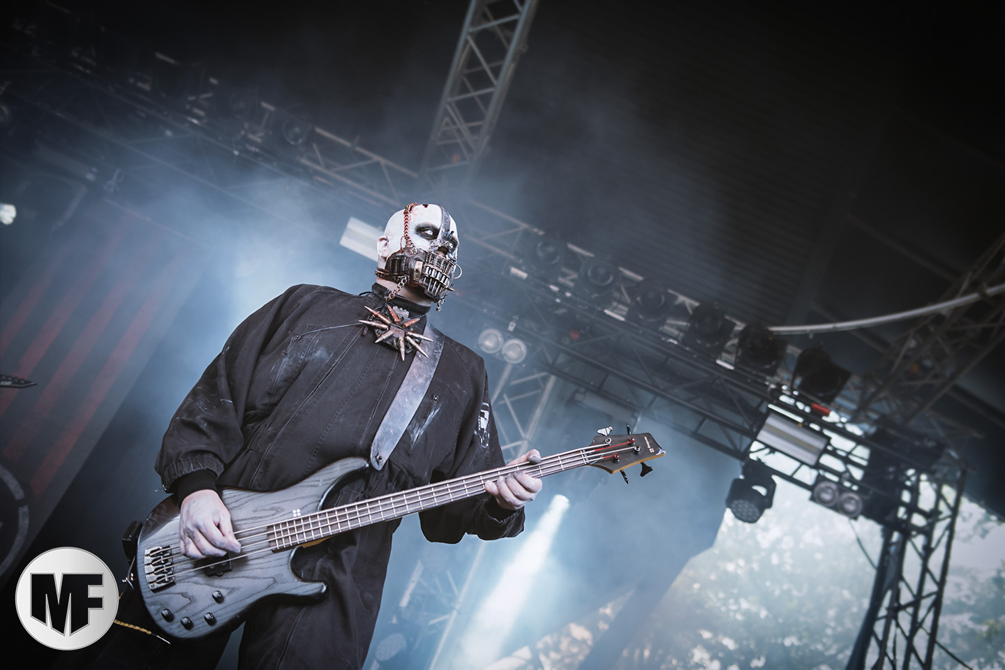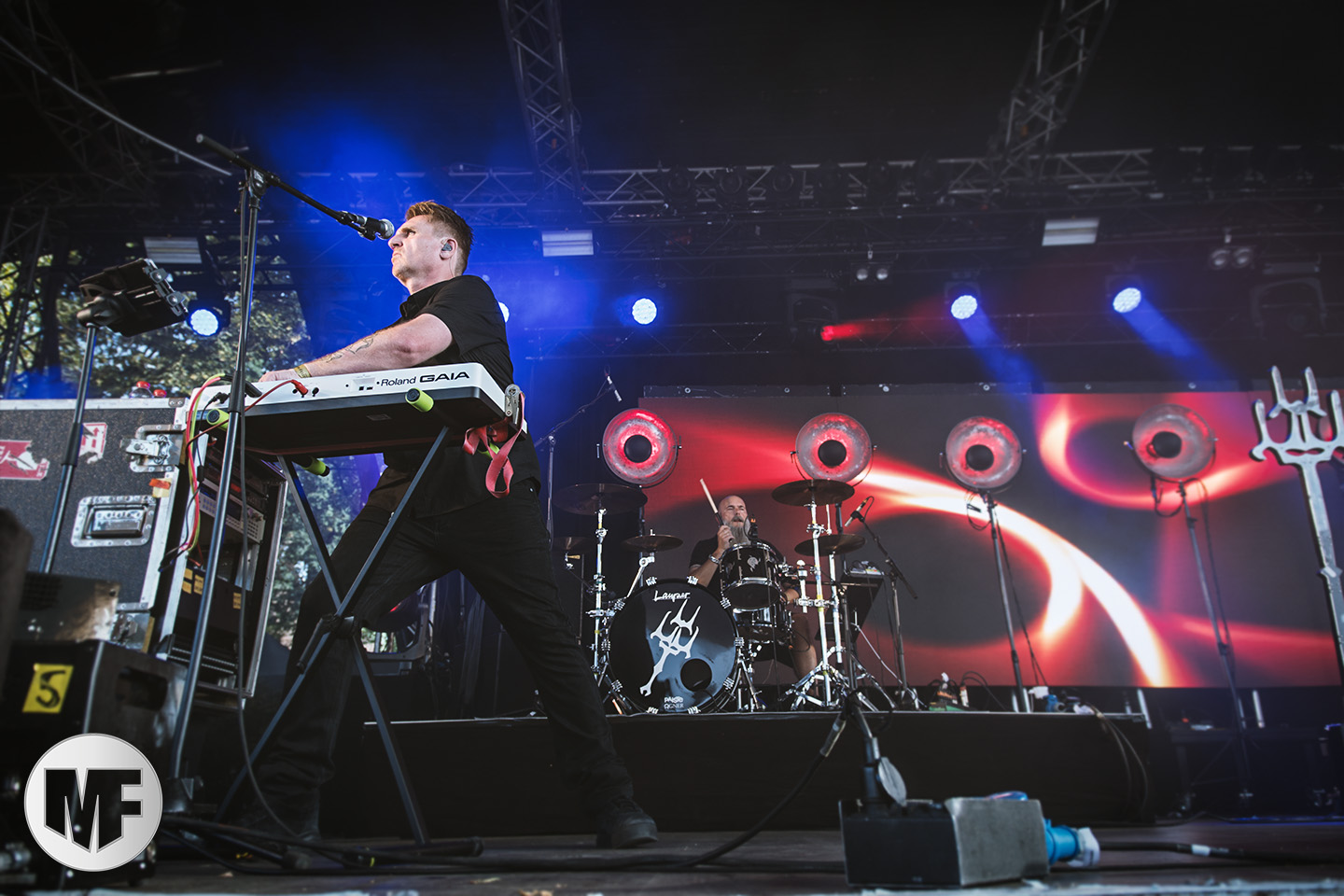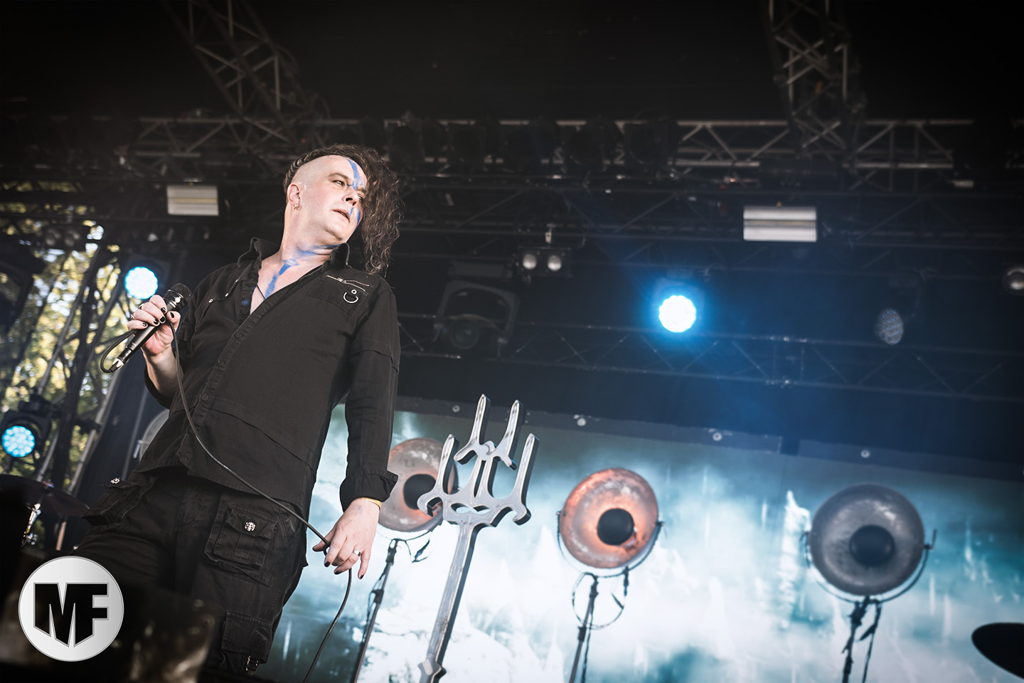 Mais assez traîné, le public est au taquet devant la scène, impatient d’en découdre avec l’un des groupes les plus emblématique de la scène NDH (comprenez Neue Deutsche Härte, nouveau son allemand). Avec leur visuel gore bien reconnaissable sur scène : tenues sanguinolentes, make-up morbide, masques steampunk horrifiques, couteau de boucher… OST+FRONT est un groupe qu’il faut prendre au second voire troisième degré, tant ils se servent de références militaires et violentes pour provoquer. Les paroles elles-mêmes, souvent censurées, sont crues et agressives. En voyant le plastron ensanglanté du chanteur et son maquillage cadavérique, on ne peut s’empêcher de penser à Till Lindemann et ses performances scéniques sur Mein Teil, jusqu’à sa voix dont on sent bien les influences « rammsteiniennes » malgré moins de puissances. Des personnages secondaires, Elsa Edelweiss au look ambigu et sombrero surdimensionné, une infirmière inquiétante, une dominatrice sexy, étoffent le groupe sur de nombreux titres. Les fans s’époumonent dès le début du set sur Fiesta de Sexo (pas besoin de sous-titres), motivés par le chanteur, singulièrement sympathique malgré son accoutrement. Mensch et Heavy Metal maintiennent la pression dans le public. Les rythmes sont remarquables, à la fois martiaux avec une ligne mélodique indéniable. Au final, sous le lâcher de ballons noirs qui annonce la fin des hostilités, on reste quand même scotché par la performance scénique, c’est le plus intéressant des concerts, visuellement parlant jusqu’à maintenant.