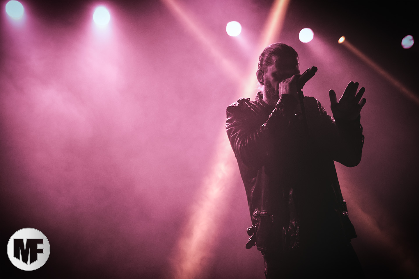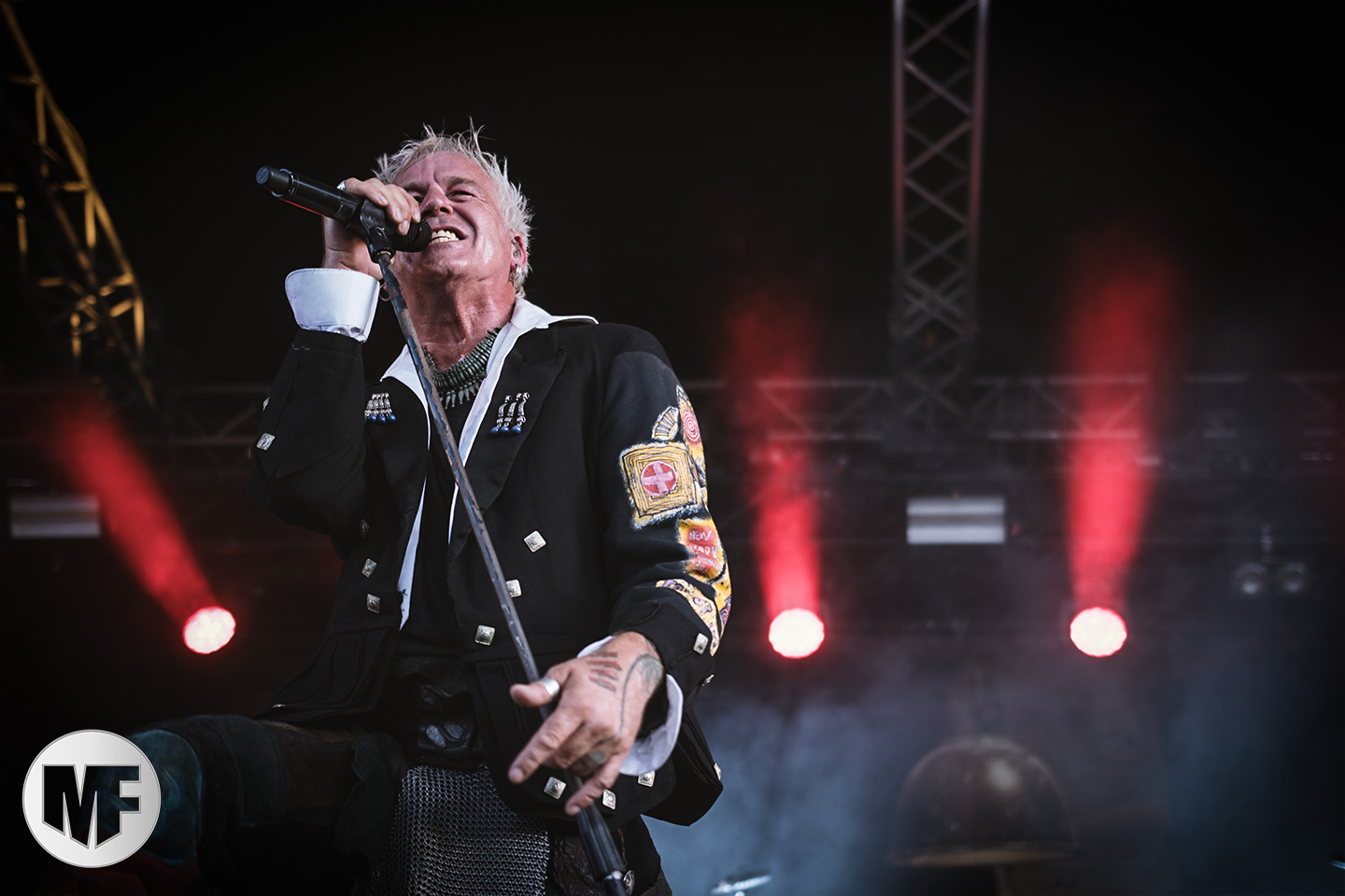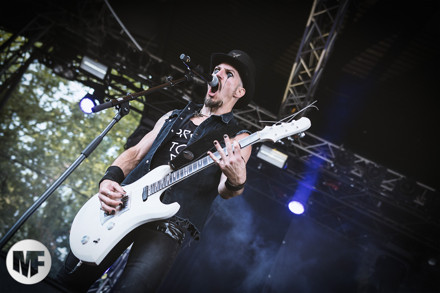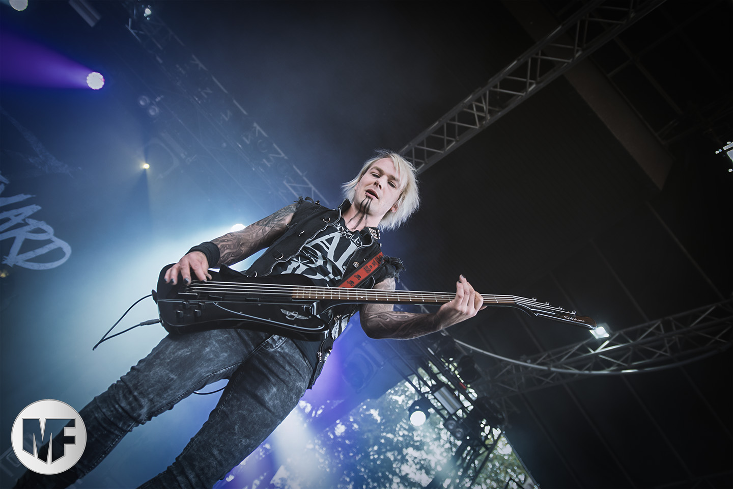 Mais assez traîné, le public est au taquet devant la scène, impatient d’en découdre avec l’un des groupes les plus emblématique de la scène NDH (comprenez Neue Deutsche Härte, nouveau son allemand). Avec leur visuel gore bien reconnaissable sur scène : tenues sanguinolentes, make-up morbide, masques steampunk horrifiques, couteau de boucher… OST+FRONT est un groupe qu’il faut prendre au second voire troisième degré, tant ils se servent de références militaires et violentes pour provoquer. Les paroles elles-mêmes, souvent censurées, sont crues et agressives. En voyant le plastron ensanglanté du chanteur et son maquillage cadavérique, on ne peut s’empêcher de penser à Till Lindemann et ses performances scéniques sur Mein Teil, jusqu’à sa voix dont on sent bien les influences « rammsteiniennes » malgré moins de puissances. Des personnages secondaires, Elsa Edelweiss au look ambigu et sombrero surdimensionné, une infirmière inquiétante, une dominatrice sexy, étoffent le groupe sur de nombreux titres. Les fans s’époumonent dès le début du set sur Fiesta de Sexo (pas besoin de sous-titres), motivés par le chanteur, singulièrement sympathique malgré son accoutrement. Mensch et Heavy Metal maintiennent la pression dans le public. Les rythmes sont remarquables, à la fois martiaux avec une ligne mélodique indéniable. Au final, sous le lâcher de ballons noirs qui annonce la fin des hostilités, on reste quand même scotché par la performance scénique, c’est le plus intéressant des concerts, visuellement parlant jusqu’à maintenant.
