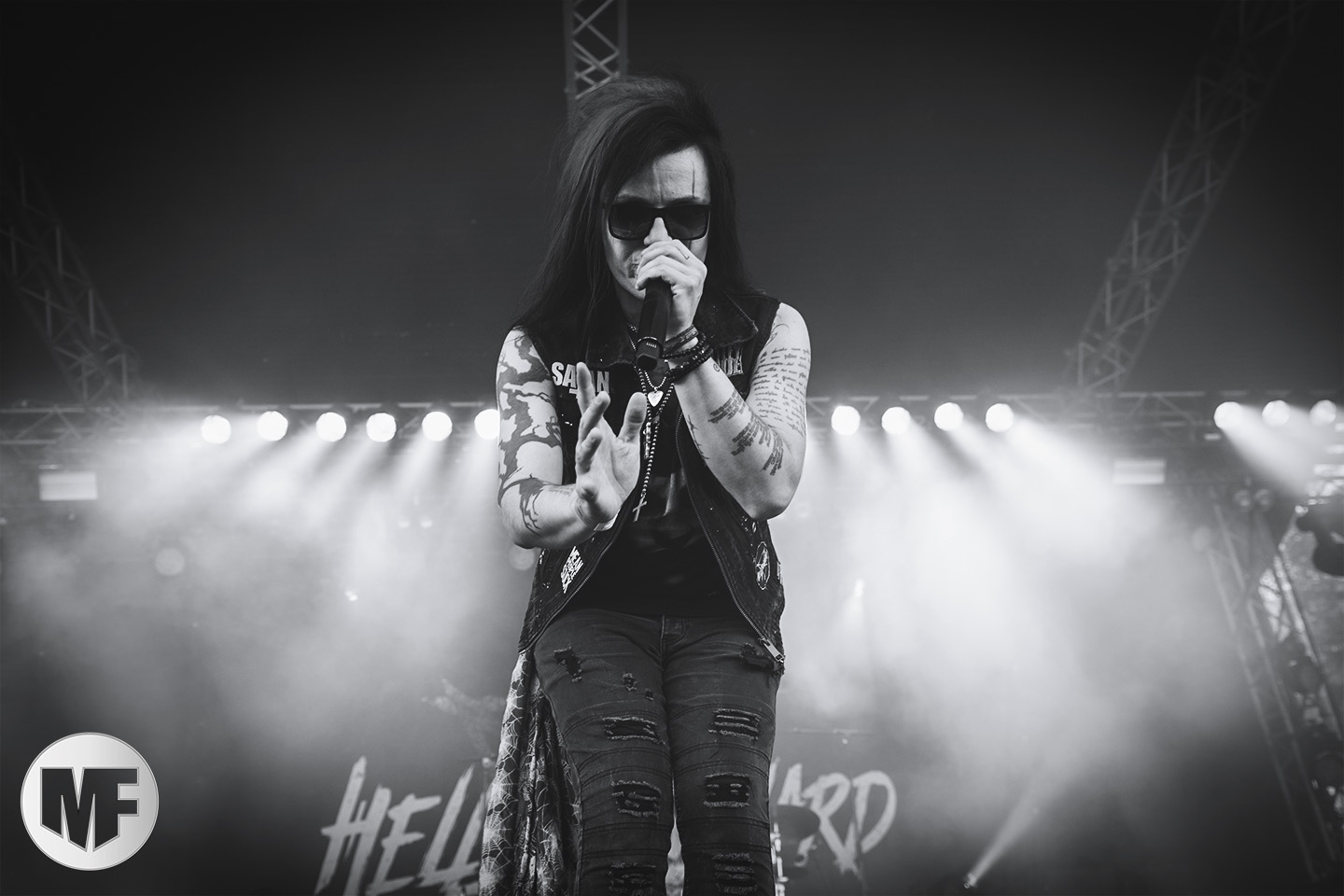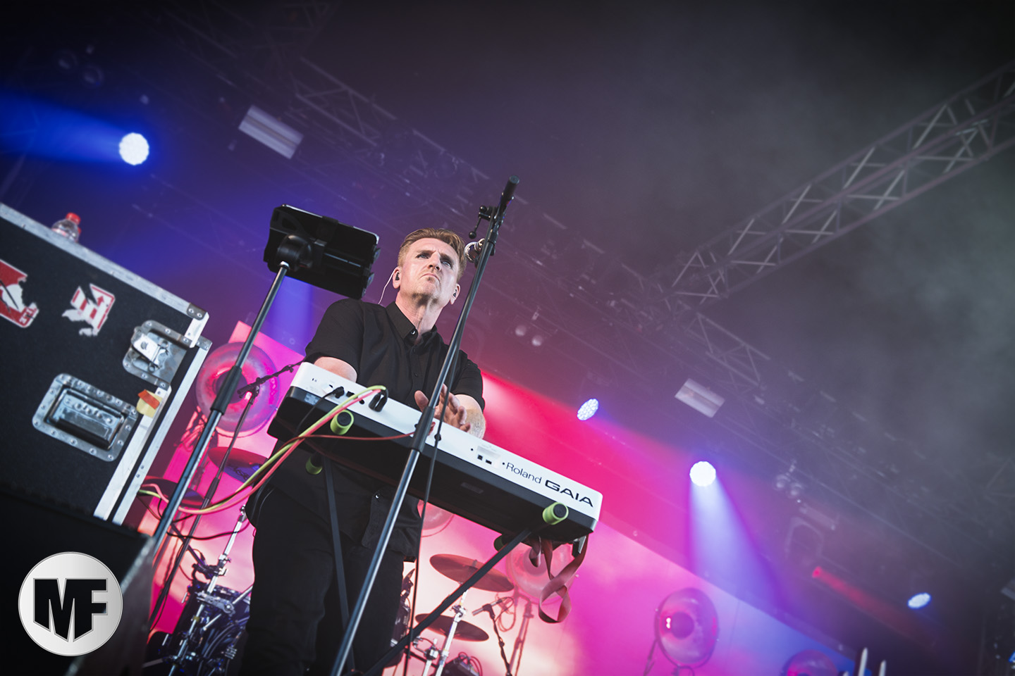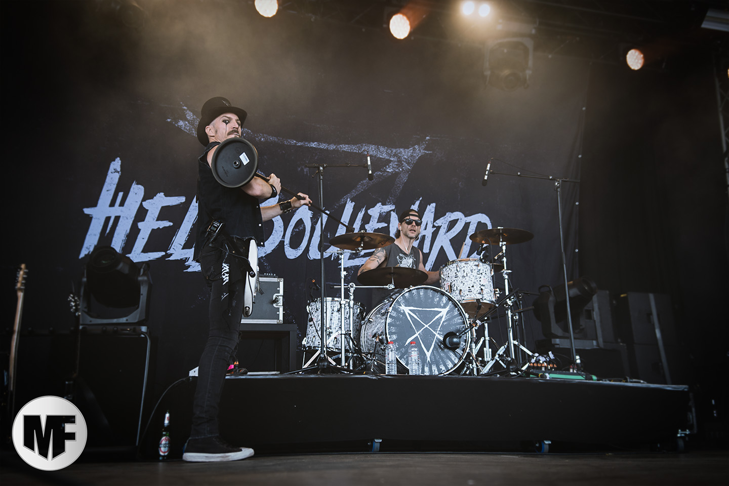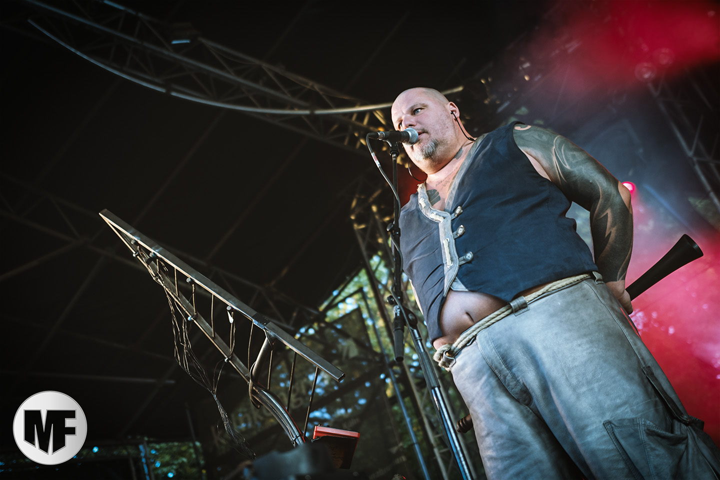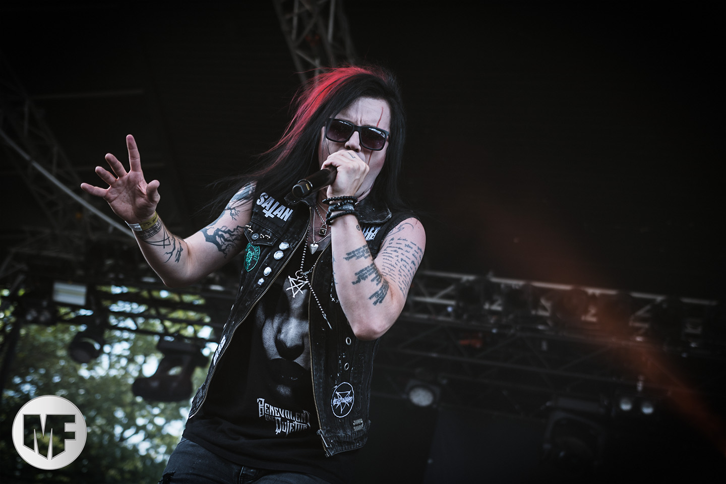 Mais assez traîné, le public est au taquet devant la scène, impatient d’en découdre avec l’un des groupes les plus emblématique de la scène NDH (comprenez Neue Deutsche Härte, nouveau son allemand). Avec leur visuel gore bien reconnaissable sur scène : tenues sanguinolentes, make-up morbide, masques steampunk horrifiques, couteau de boucher… OST+FRONT est un groupe qu’il faut prendre au second voire troisième degré, tant ils se servent de références militaires et violentes pour provoquer. Les paroles elles-mêmes, souvent censurées, sont crues et agressives. En voyant le plastron ensanglanté du chanteur et son maquillage cadavérique, on ne peut s’empêcher de penser à Till Lindemann et ses performances scéniques sur Mein Teil, jusqu’à sa voix dont on sent bien les influences « rammsteiniennes » malgré moins de puissances. Des personnages secondaires, Elsa Edelweiss au look ambigu et sombrero surdimensionné, une infirmière inquiétante, une dominatrice sexy, étoffent le groupe sur de nombreux titres. Les fans s’époumonent dès le début du set sur Fiesta de Sexo (pas besoin de sous-titres), motivés par le chanteur, singulièrement sympathique malgré son accoutrement. Mensch et Heavy Metal maintiennent la pression dans le public. Les rythmes sont remarquables, à la fois martiaux avec une ligne mélodique indéniable. Au final, sous le lâcher de ballons noirs qui annonce la fin des hostilités, on reste quand même scotché par la performance scénique, c’est le plus intéressant des concerts, visuellement parlant jusqu’à maintenant.