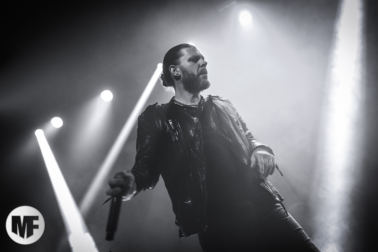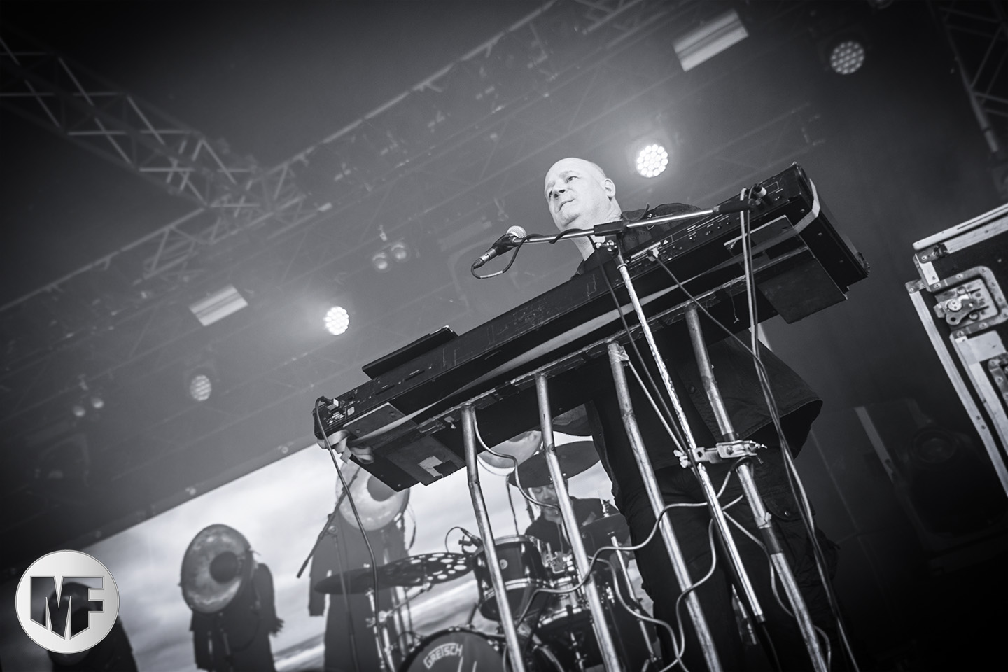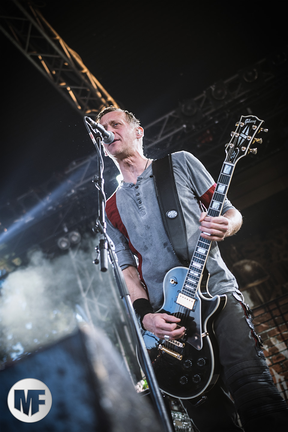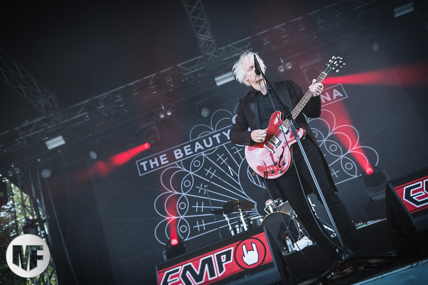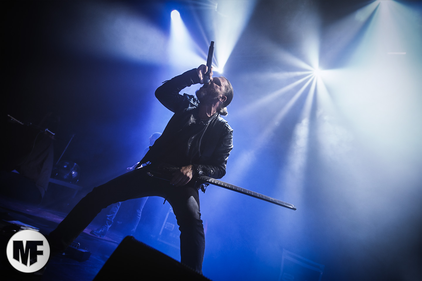 Mais assez traîné, le public est au taquet devant la scène, impatient d’en découdre avec l’un des groupes les plus emblématique de la scène NDH (comprenez Neue Deutsche Härte, nouveau son allemand). Avec leur visuel gore bien reconnaissable sur scène : tenues sanguinolentes, make-up morbide, masques steampunk horrifiques, couteau de boucher… OST+FRONT est un groupe qu’il faut prendre au second voire troisième degré, tant ils se servent de références militaires et violentes pour provoquer. Les paroles elles-mêmes, souvent censurées, sont crues et agressives. En voyant le plastron ensanglanté du chanteur et son maquillage cadavérique, on ne peut s’empêcher de penser à Till Lindemann et ses performances scéniques sur Mein Teil, jusqu’à sa voix dont on sent bien les influences « rammsteiniennes » malgré moins de puissances. Des personnages secondaires, Elsa Edelweiss au look ambigu et sombrero surdimensionné, une infirmière inquiétante, une dominatrice sexy, étoffent le groupe sur de nombreux titres. Les fans s’époumonent dès le début du set sur Fiesta de Sexo (pas besoin de sous-titres), motivés par le chanteur, singulièrement sympathique malgré son accoutrement. Mensch et Heavy Metal maintiennent la pression dans le public. Les rythmes sont remarquables, à la fois martiaux avec une ligne mélodique indéniable. Au final, sous le lâcher de ballons noirs qui annonce la fin des hostilités, on reste quand même scotché par la performance scénique, c’est le plus intéressant des concerts, visuellement parlant jusqu’à maintenant.