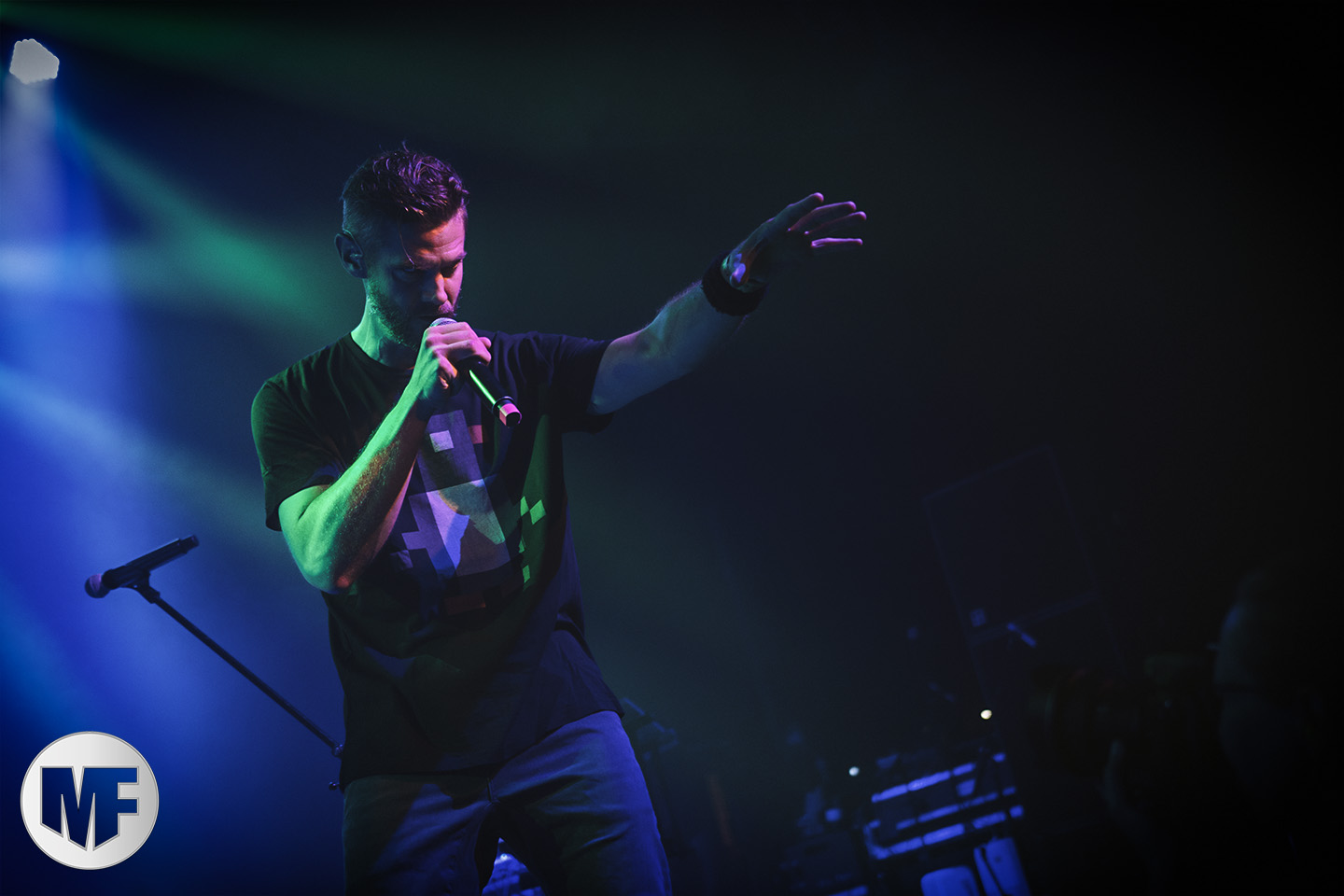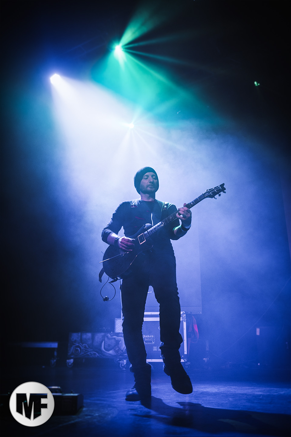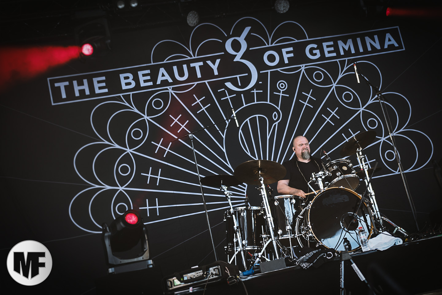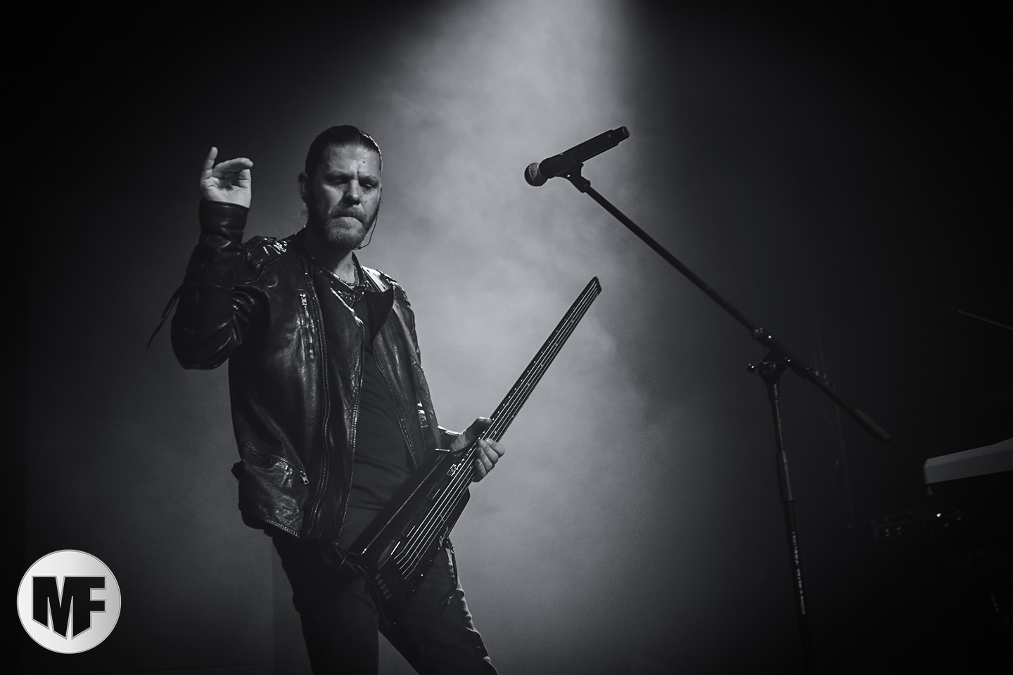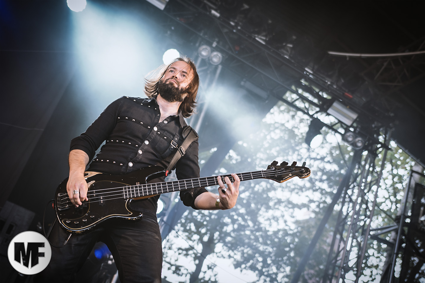 Mais assez traîné, le public est au taquet devant la scène, impatient d’en découdre avec l’un des groupes les plus emblématique de la scène NDH (comprenez Neue Deutsche Härte, nouveau son allemand). Avec leur visuel gore bien reconnaissable sur scène : tenues sanguinolentes, make-up morbide, masques steampunk horrifiques, couteau de boucher… OST+FRONT est un groupe qu’il faut prendre au second voire troisième degré, tant ils se servent de références militaires et violentes pour provoquer. Les paroles elles-mêmes, souvent censurées, sont crues et agressives. En voyant le plastron ensanglanté du chanteur et son maquillage cadavérique, on ne peut s’empêcher de penser à Till Lindemann et ses performances scéniques sur Mein Teil, jusqu’à sa voix dont on sent bien les influences « rammsteiniennes » malgré moins de puissances. Des personnages secondaires, Elsa Edelweiss au look ambigu et sombrero surdimensionné, une infirmière inquiétante, une dominatrice sexy, étoffent le groupe sur de nombreux titres. Les fans s’époumonent dès le début du set sur Fiesta de Sexo (pas besoin de sous-titres), motivés par le chanteur, singulièrement sympathique malgré son accoutrement. Mensch et Heavy Metal maintiennent la pression dans le public. Les rythmes sont remarquables, à la fois martiaux avec une ligne mélodique indéniable. Au final, sous le lâcher de ballons noirs qui annonce la fin des hostilités, on reste quand même scotché par la performance scénique, c’est le plus intéressant des concerts, visuellement parlant jusqu’à maintenant.