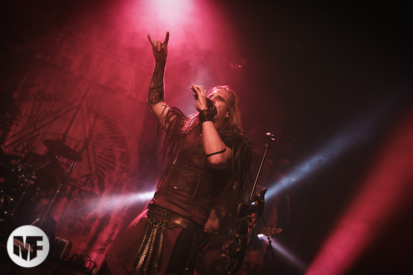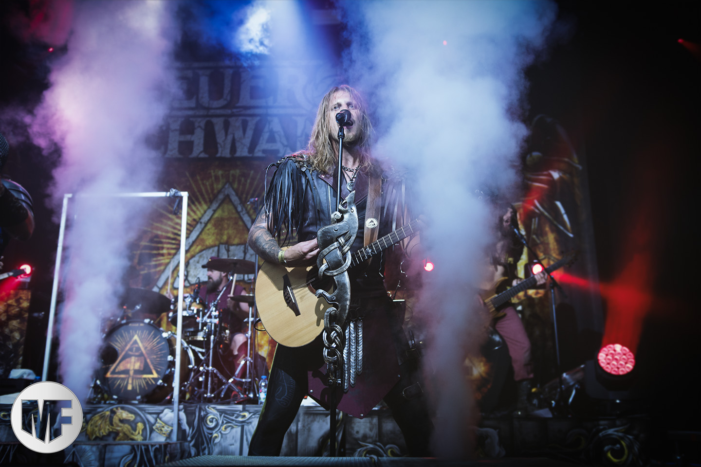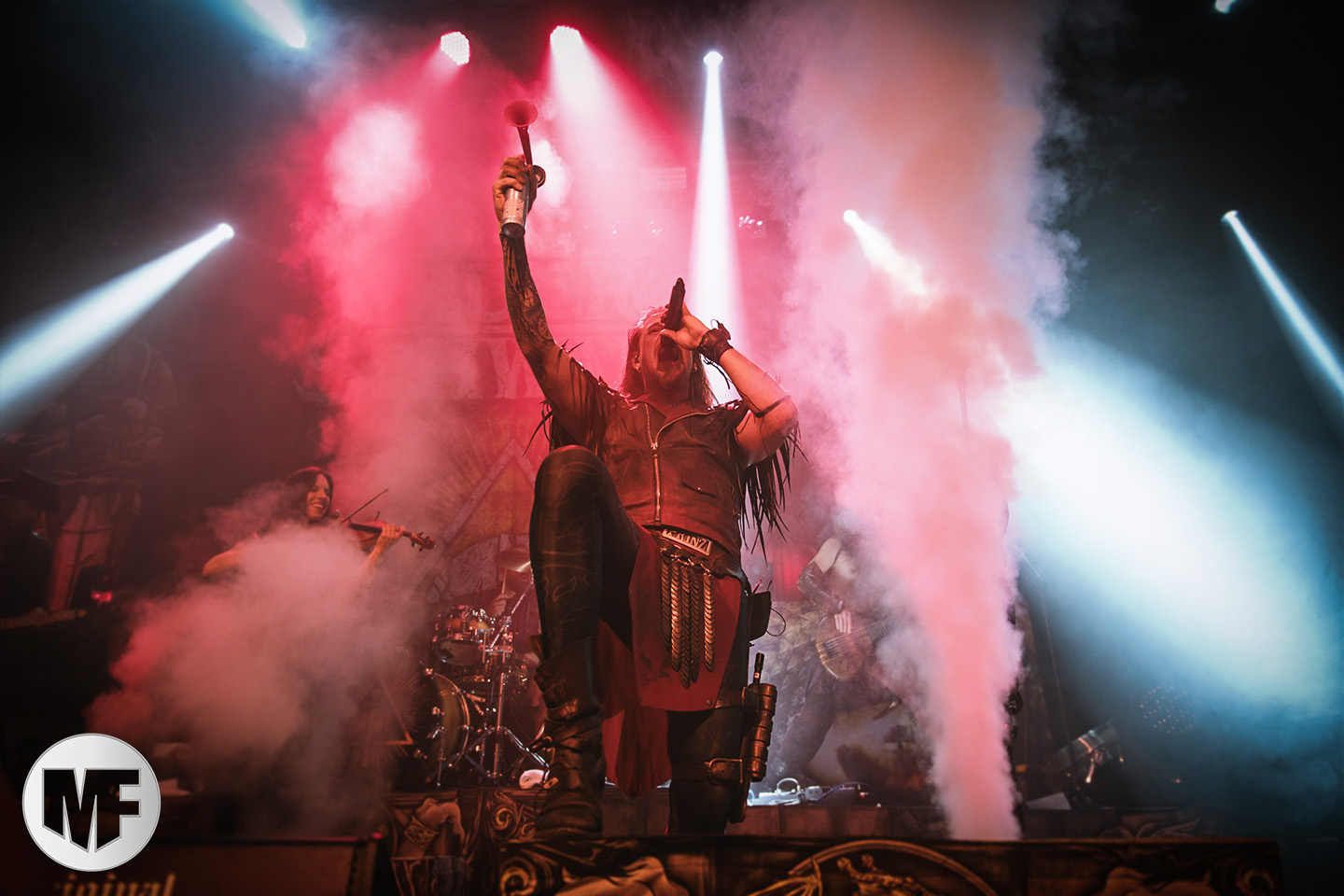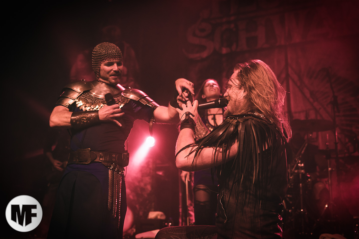 Lorsque s’approchent de la scène des spectateurs en tenue médievale ou viking, cornes à la main, pas besoin d’être devin pour comprendre que FEUERSCHWANZ est dans les parages. Ce groupe, hyper festif, draine derrière lui depuis quelques années déjà un public enthousiaste, prêt à chanter et danser sur les chansons épiques et paillardes inspirées du folklore moyennâgeux teuton. Notre allemand n’étant pas à la hauteur pour apprécier les plaisanteries et anecdotes racontées par le chanteur Hauptmann Feuerschwanz, nous nous contenterons donc de profiter du spectacle et de la musique. Spectacle qui aurait du être proposé en extérieur à notre avis, car dans une salle le groupe n’est pas forcément à son aise pour évoluer, surtout lorsque une gigantesque massue fait son apparition au bras du leader ! Pour autant pas besoin d’être bilingue pour comprendre les Hörchen Hoch scandés par le public, geste à l’appui. Tout le monde lève, qui sa corne, qui son verre, et c’est parti pour une danse endiablée ! La présence coquine des Mieze (ou minettes, en tout cas de charmantes jeunes femmes court vêtues) est fort appréciée du public masculin, tandis que la gente féminine n’a d’yeux que pour le Prinz Richard Hodenherz, second chanteur et flûtiste du groupe. On remarque aussi la belle violoncelliste qui virevolte sur scène et donne la cadence, notamment sur Schubsetanz, entraînant avec elle le public.