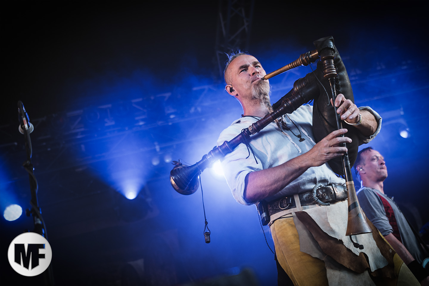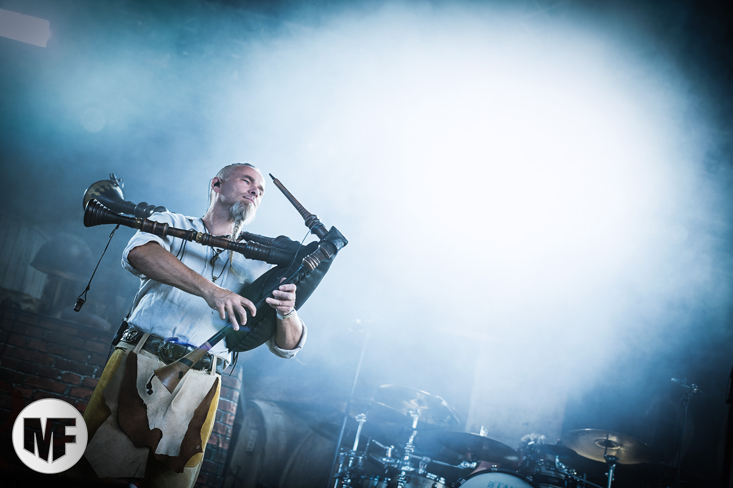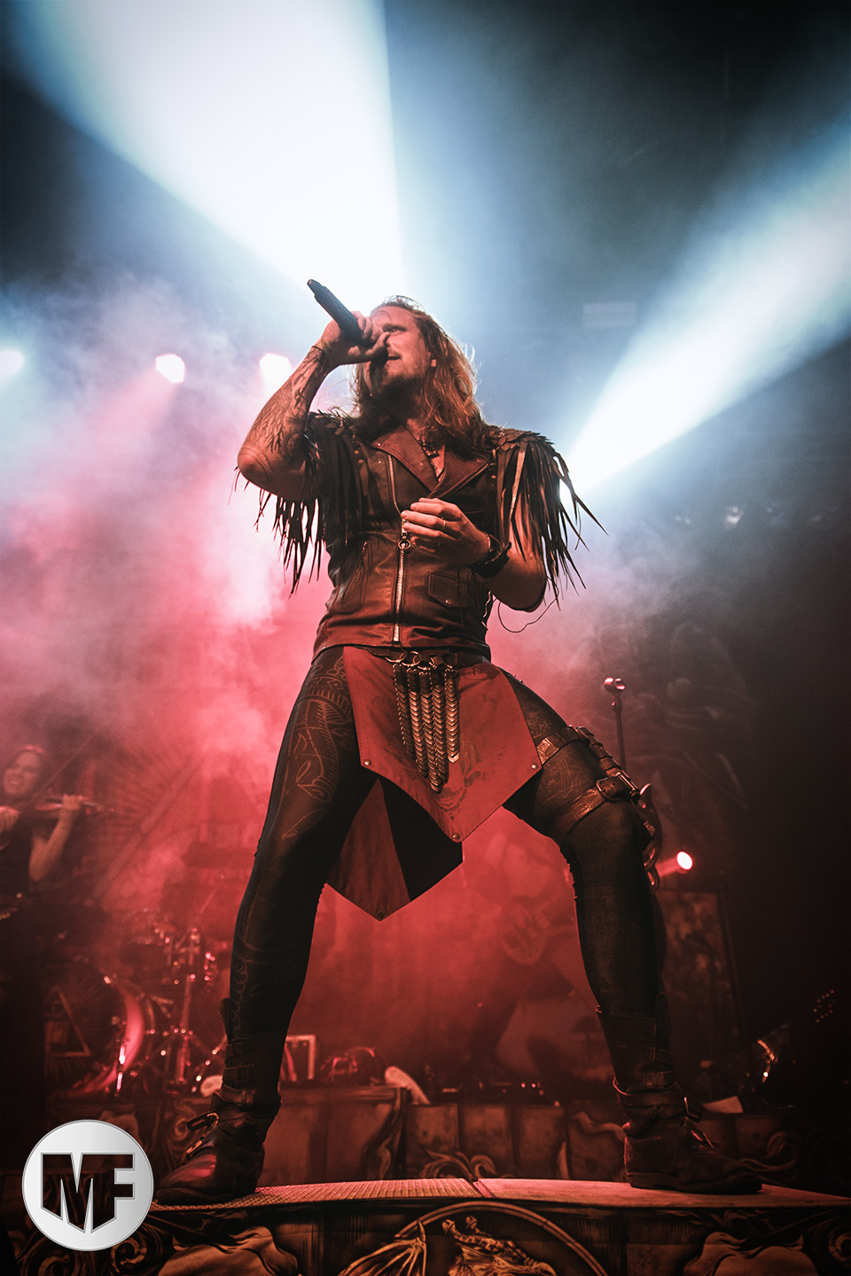 Lorsque s’approchent de la scène des spectateurs en tenue médievale ou viking, cornes à la main, pas besoin d’être devin pour comprendre que FEUERSCHWANZ est dans les parages. Ce groupe, hyper festif, draine derrière lui depuis quelques années déjà un public enthousiaste, prêt à chanter et danser sur les chansons épiques et paillardes inspirées du folklore moyennâgeux teuton. Notre allemand n’étant pas à la hauteur pour apprécier les plaisanteries et anecdotes racontées par le chanteur Hauptmann Feuerschwanz, nous nous contenterons donc de profiter du spectacle et de la musique. Spectacle qui aurait du être proposé en extérieur à notre avis, car dans une salle le groupe n’est pas forcément à son aise pour évoluer, surtout lorsque une gigantesque massue fait son apparition au bras du leader ! Pour autant pas besoin d’être bilingue pour comprendre les Hörchen Hoch scandés par le public, geste à l’appui. Tout le monde lève, qui sa corne, qui son verre, et c’est parti pour une danse endiablée ! La présence coquine des Mieze (ou minettes, en tout cas de charmantes jeunes femmes court vêtues) est fort appréciée du public masculin, tandis que la gente féminine n’a d’yeux que pour le Prinz Richard Hodenherz, second chanteur et flûtiste du groupe. On remarque aussi la belle violoncelliste qui virevolte sur scène et donne la cadence, notamment sur Schubsetanz, entraînant avec elle le public.