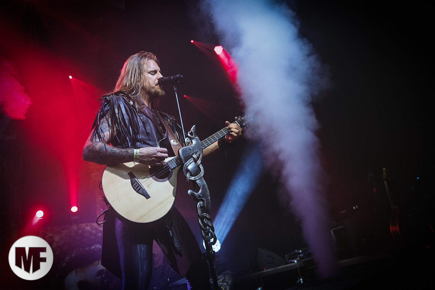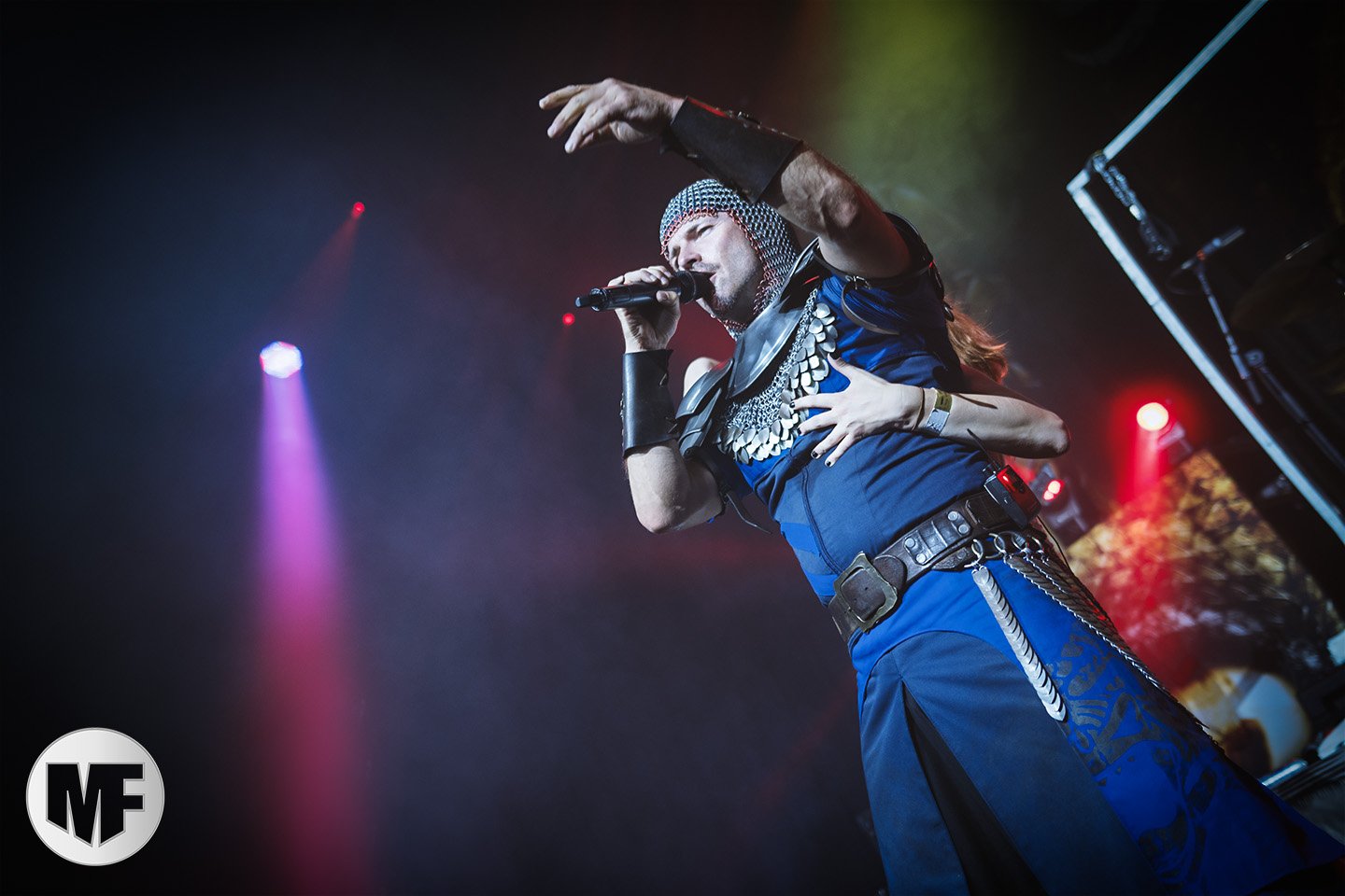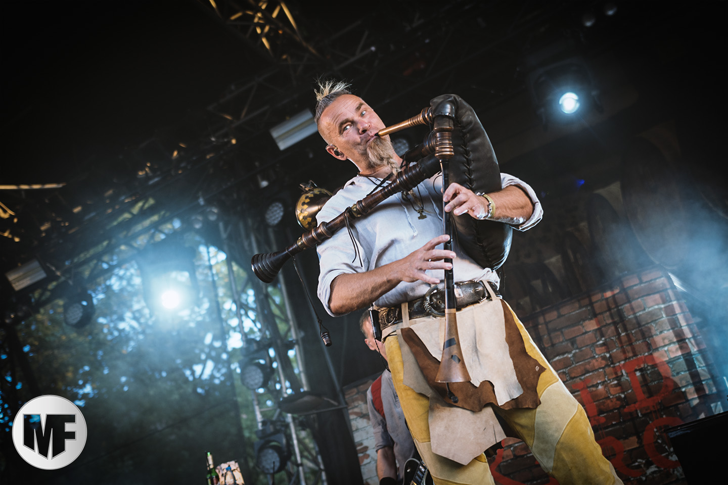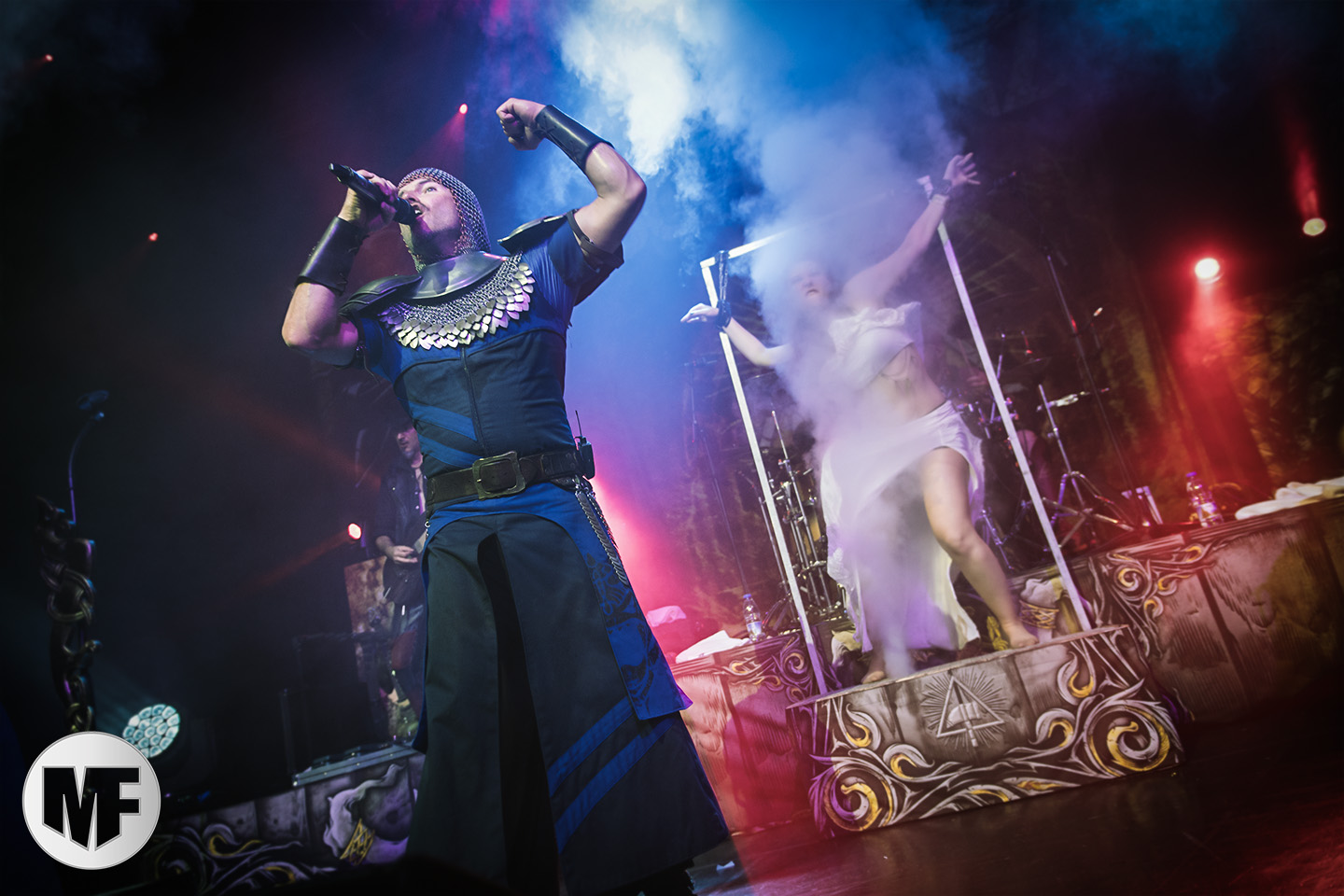Lorsque s’approchent de la scène des spectateurs en tenue médievale ou viking, cornes à la main, pas besoin d’être devin pour comprendre que FEUERSCHWANZ est dans les parages. Ce groupe, hyper festif, draine derrière lui depuis quelques années déjà un public enthousiaste, prêt à chanter et danser sur les chansons épiques et paillardes inspirées du folklore moyennâgeux teuton. Notre allemand n’étant pas à la hauteur pour apprécier les plaisanteries et anecdotes racontées par le chanteur Hauptmann Feuerschwanz, nous nous contenterons donc de profiter du spectacle et de la musique. Spectacle qui aurait du être proposé en extérieur à notre avis, car dans une salle le groupe n’est pas forcément à son aise pour évoluer, surtout lorsque une gigantesque massue fait son apparition au bras du leader ! Pour autant pas besoin d’être bilingue pour comprendre les Hörchen Hoch scandés par le public, geste à l’appui. Tout le monde lève, qui sa corne, qui son verre, et c’est parti pour une danse endiablée ! La présence coquine des Mieze (ou minettes, en tout cas de charmantes jeunes femmes court vêtues) est fort appréciée du public masculin, tandis que la gente féminine n’a d’yeux que pour le Prinz Richard Hodenherz, second chanteur et flûtiste du groupe. On remarque aussi la belle violoncelliste qui virevolte sur scène et donne la cadence, notamment sur Schubsetanz, entraînant avec elle le public.
