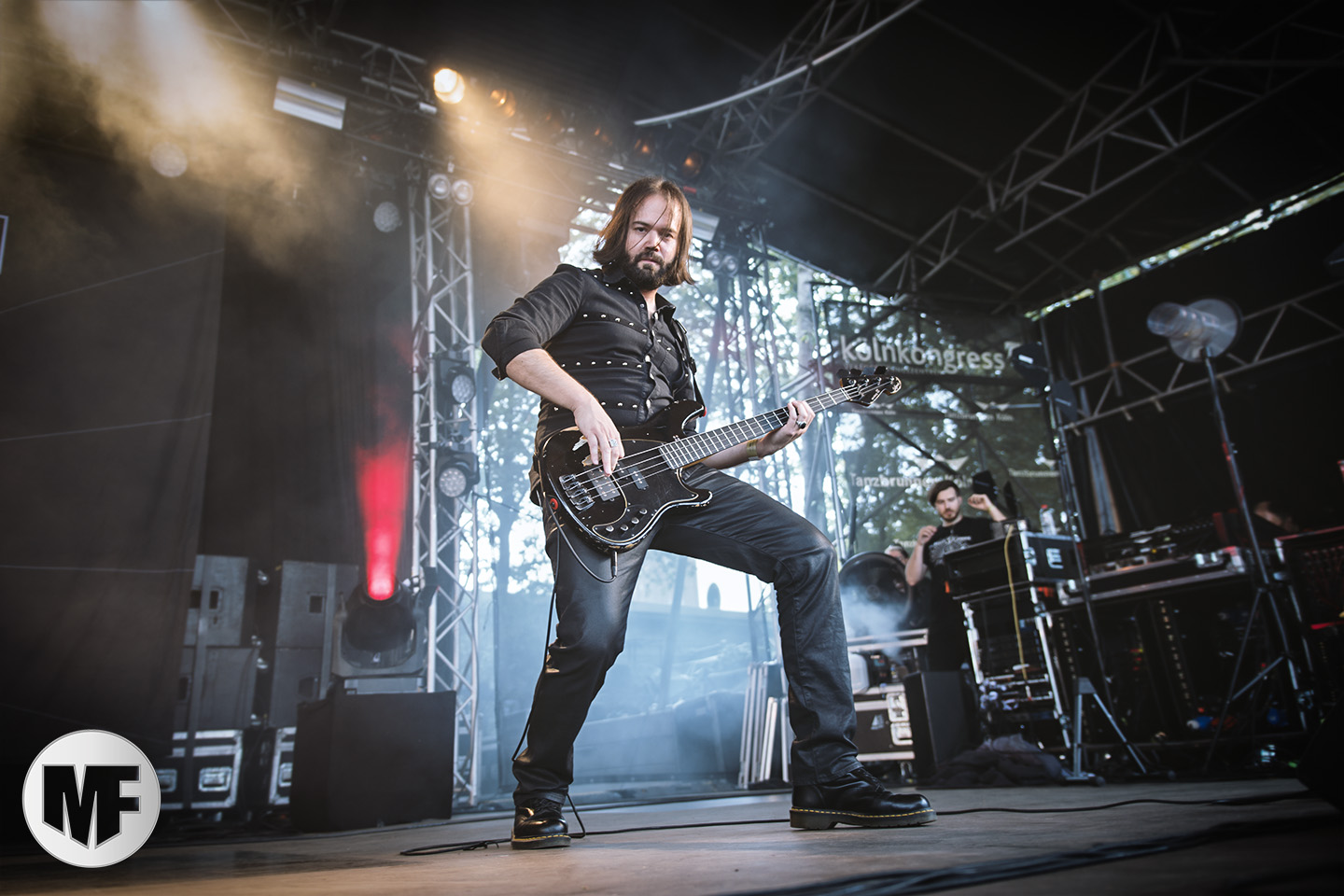 Les yeux piquent un peu en ce dimanche matin, la faute certainement au soleil voilé qui chauffe le festival. Le programme de la journée s’annonce fort intéressant, et plutôt varié. On commence sur la Mainstage avec HELL BOULEVARD, un groupe venu de Suisse avec son frontman Matteo Fabiani, auparavant leader de LOST AREA mais également réalisateur de clips pour de nombreux groupes allemands. Le terme gothic rock définit parfaitement le style musical que les Suisses développent sur scène. Le chanteur occupe particulièrement bien l’espace, sa voix grave se pose dans tous les registres. Il passe du très rock Zero fucks given , au plus mélodieux Dead Valentine avec l’aisance vocale qui nous bluffe chez tant de groupes allemands, y compris sur une cover inattendue de Baby One More Time de Britney Spears. Le public est déjà à fond malgré l’heure matinale, encouragé par le groupe qui fait partager son bonheur d’être à l’Amphi. Le set sera bien sûr trop court, mais on surveillera de près la sortie de l’album In Black We Trust prévu pour septembre, suivi de quelques dates hélas en Allemagne. En attendant le groupe suivant, une petite visite côté merchandising s’impose. Outre les stands repartis dans les allées, un chapiteau abrite de nombreux exposants, peut-être moins connus, mais tout aussi intéressants. CD, vêtements gothiques, rock, steampunk, militaires, mais aussi accessoires, sous-vêtements, coiffes, objets de décoration, il y en a pour tous les goûts. Les tarifs ne sont pas forcément très attractifs, mais les modèles sont souvent uniques.