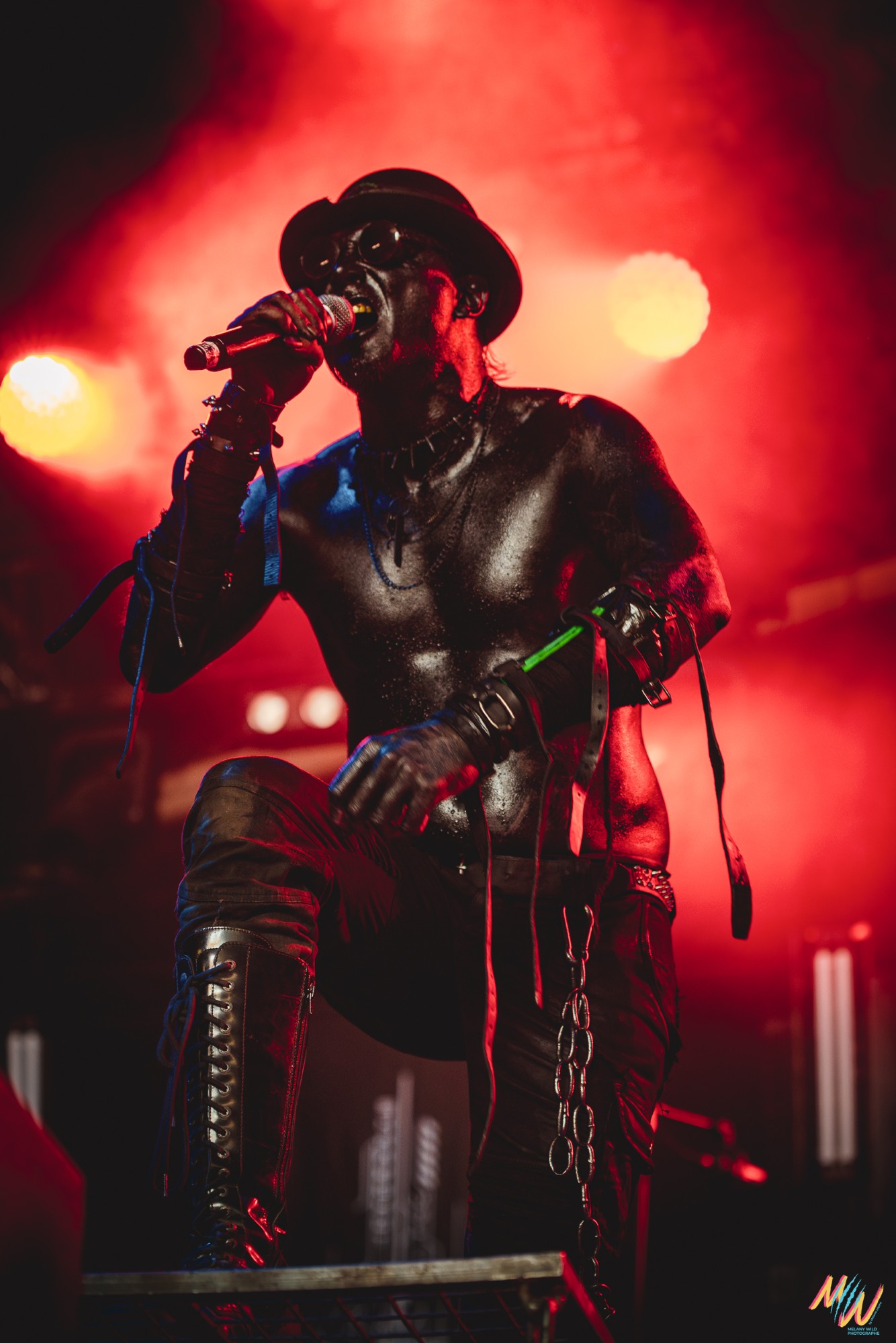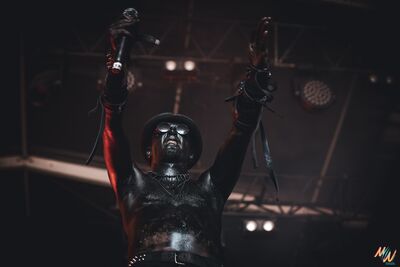 En quelques années, les français de Shaârghot ont réussi à se faire une belle place sur la scène indus. En veut pour preuve l’affluence de dingue sous la Temple qui déborde littéralement, à la fois dehors mais également sur une bonne partie de l'Altar. Il faut dire que le show est forcément au rendez-vous avec eux et leur sens de la mise en scène. Les costumes, les accessoires et les figurants, tout est là pour poser cette ambiance post-apocalyptique/fantastique qui les accompagne depuis le début. Un univers bien à eux qui participe à l'engouement toujours plus grand du public.