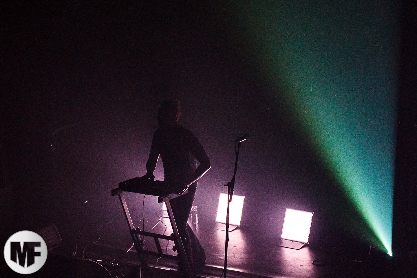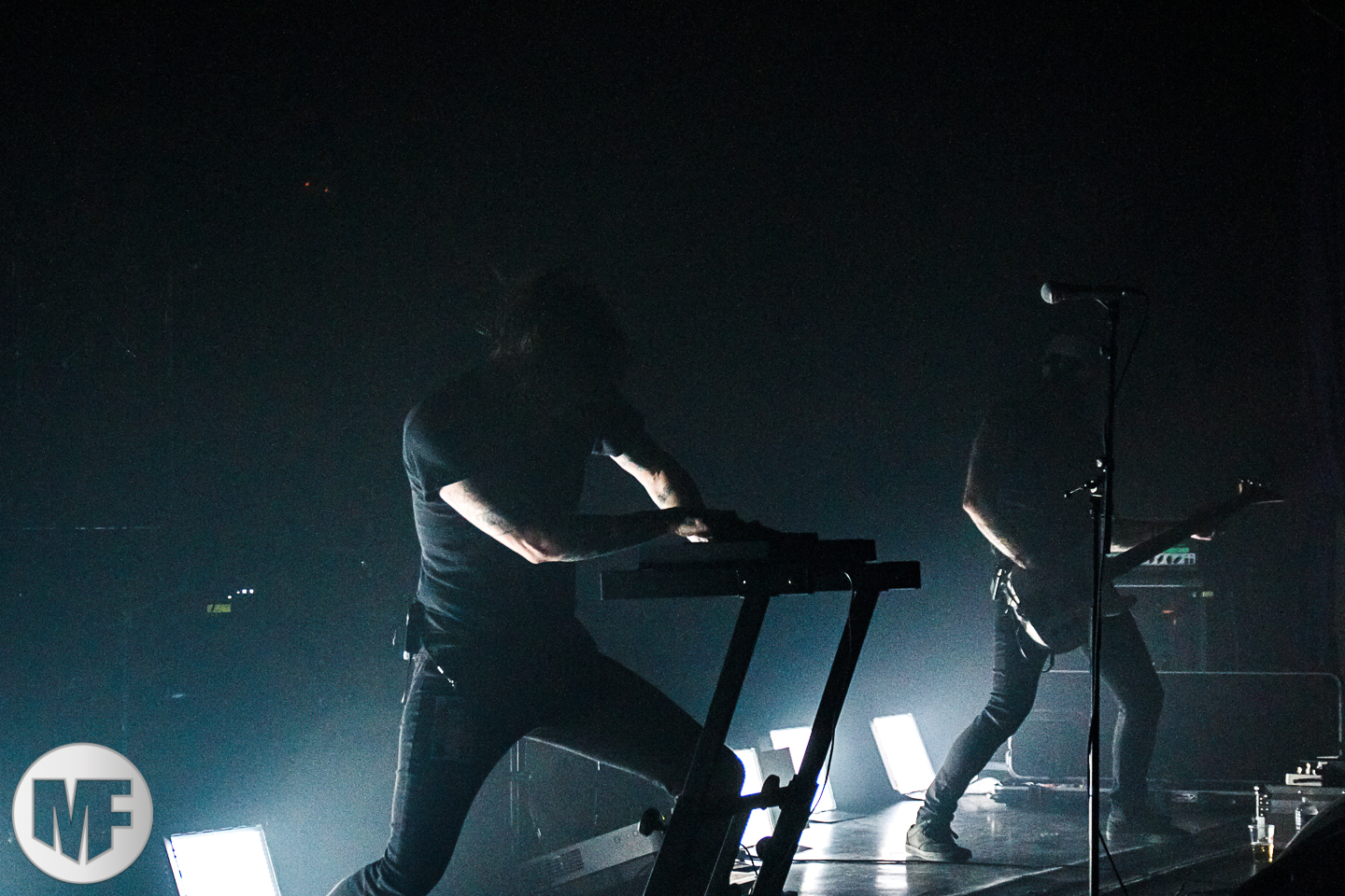 Une étrange atmosphère s’instaure dans la salle. Un silence de mort règne, il n’y a que très peu de lumière, à peine pour distinguer les quelques silhouettes qui font des allées et venues sur scène. Des samples electro surgissent avec ce ballet d’ombres sur scène lorsque, venus de nulle part, les deux membres de GOST apparaissent. Dès lors, le show commence par le lancement de la boîte à rythme et la basse truffée d’effets qui reproduit le son des synth/bass façon 1980 / 1990.